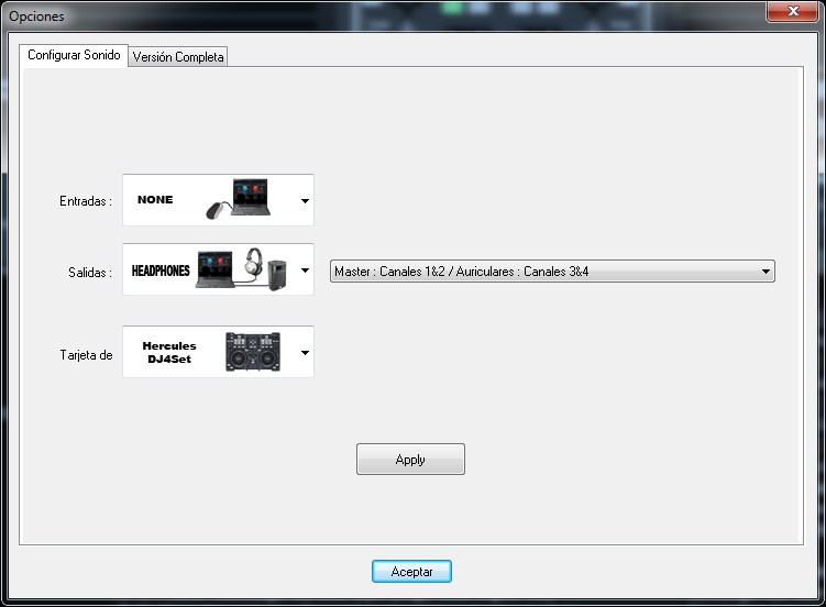 HERCULES DJ 4SET. Captura Sección «Configurar Sonido» en Opciones de Configuración Limitadas del Virtual DJ v7.0.3LE