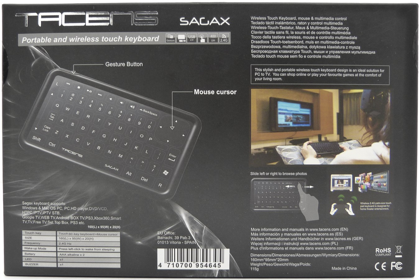 Review Mini Teclado Táctil Inalámbrico TACENS SAGAX USB 2.0 Publicado el 4 de septiembre de 2021, a las 18:45 pmPublicado el 16 de diciembre de 2012, a las 23:06 pm por Raúl Planelles 2. TACENS SAGAX. Embalaje y Presentación TACENS SAGAX. Embalaje Vista en Perspectiva I TACENS SAGAX. Embalaje Vista en Perspectiva II TACENS SAGAX. Embalaje Vista Trasera TACENS SAGAX. Abriendo el Embalaje Páginas: 1 2 3 4 5 6