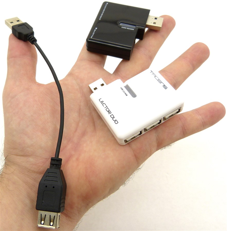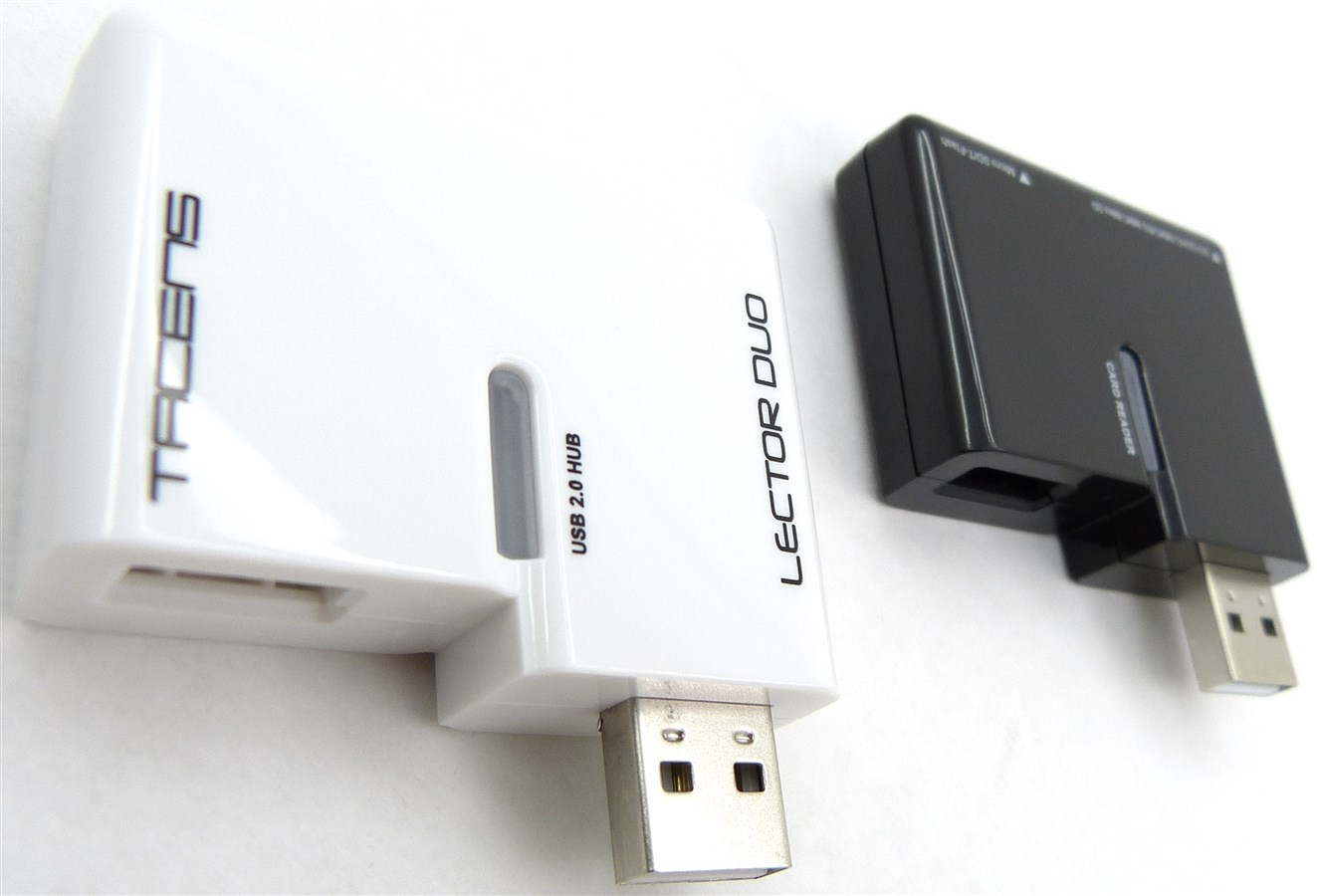 Esta configuración de doble módulo garantiza varias conexiones si además añadimos el cable extensor, a parte de garantizar según qué conexiones. Con el Lector Duo de Tacens, de un solo conector USB de nuestro PC o portátil, se pueden obtener hasta 2 puertos extra USB y 4 ranuras para tarjetas de memoria, simplemente conectando el cable extensor de un conector hembra USB del módulo blanco de los 3 disponibles al macho del módulo negro. Además, ambos módulos se pueden usar por separado, aumentando así sus posibilidades. Se nos pueden ocurrir infinidad de usos, emparejados a ordenadores portátiles, cámaras de fotos, de vídeo, etc.