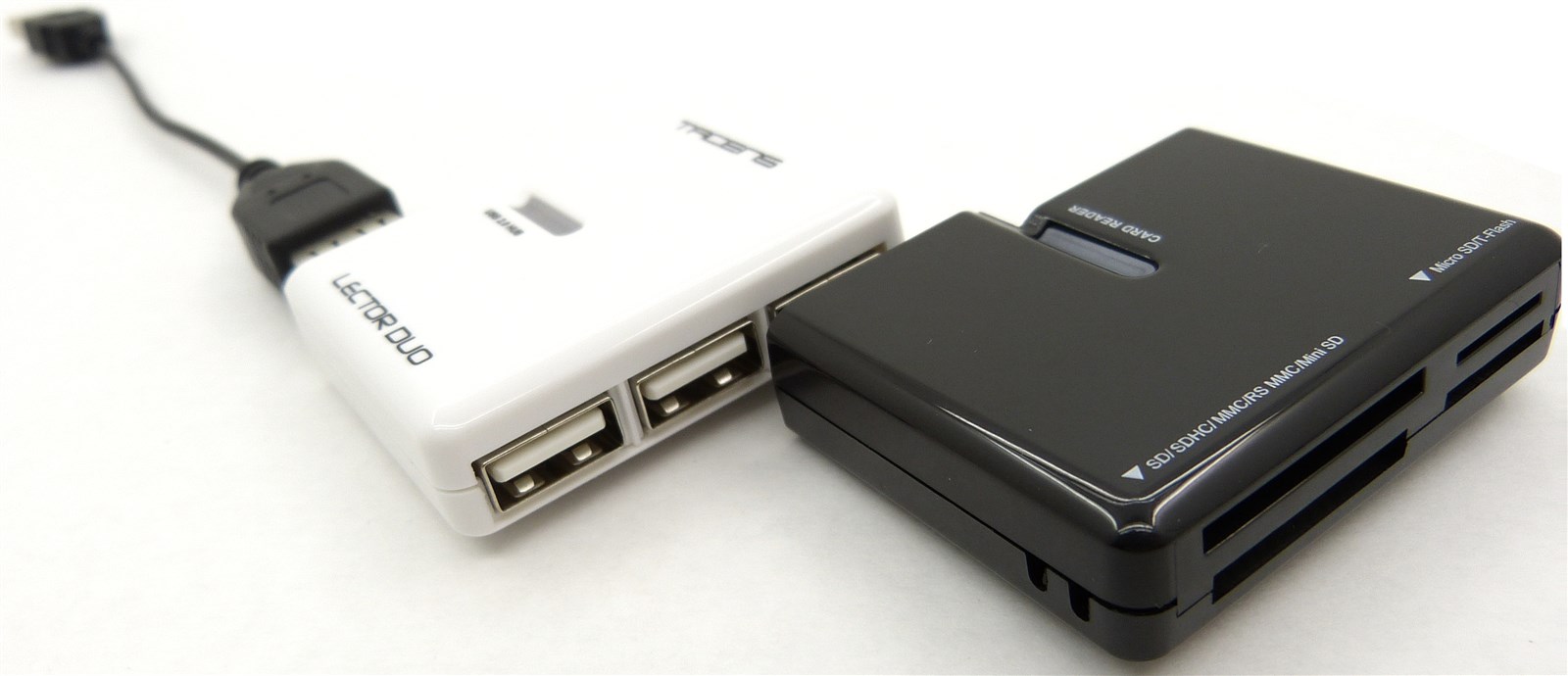 El módulo negro, es un lector de múltiples tarjetas de memoria, compatible con hasta 51 modelos según el fabricante, a través de sus 4 ranuras, perfectamente descritas con los nombres de los principales tipos de tarjetas por ambas caras. El otro módulo, de color blanco, es un pequeño hub de 3 conectores USB, con lo que ganamos 2 conectores extra, ya que utiliza uno puente para alimentarse.