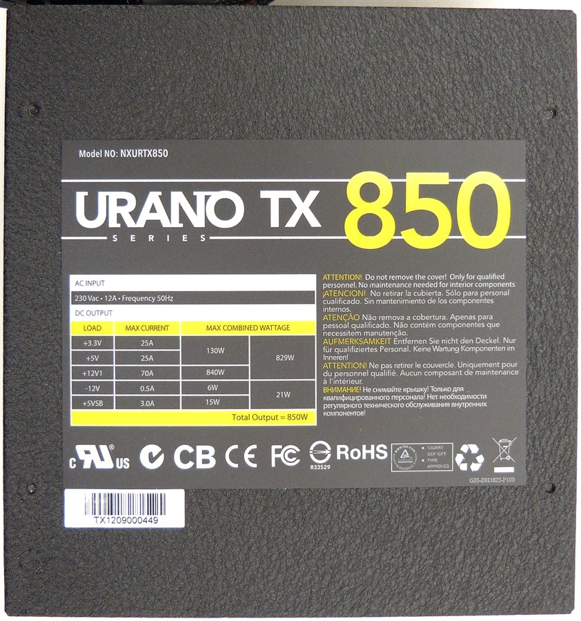 NOX XTREME URANO TX 850W. Fuente Vista Superior. Pegatina Especificaciones Técnicas
