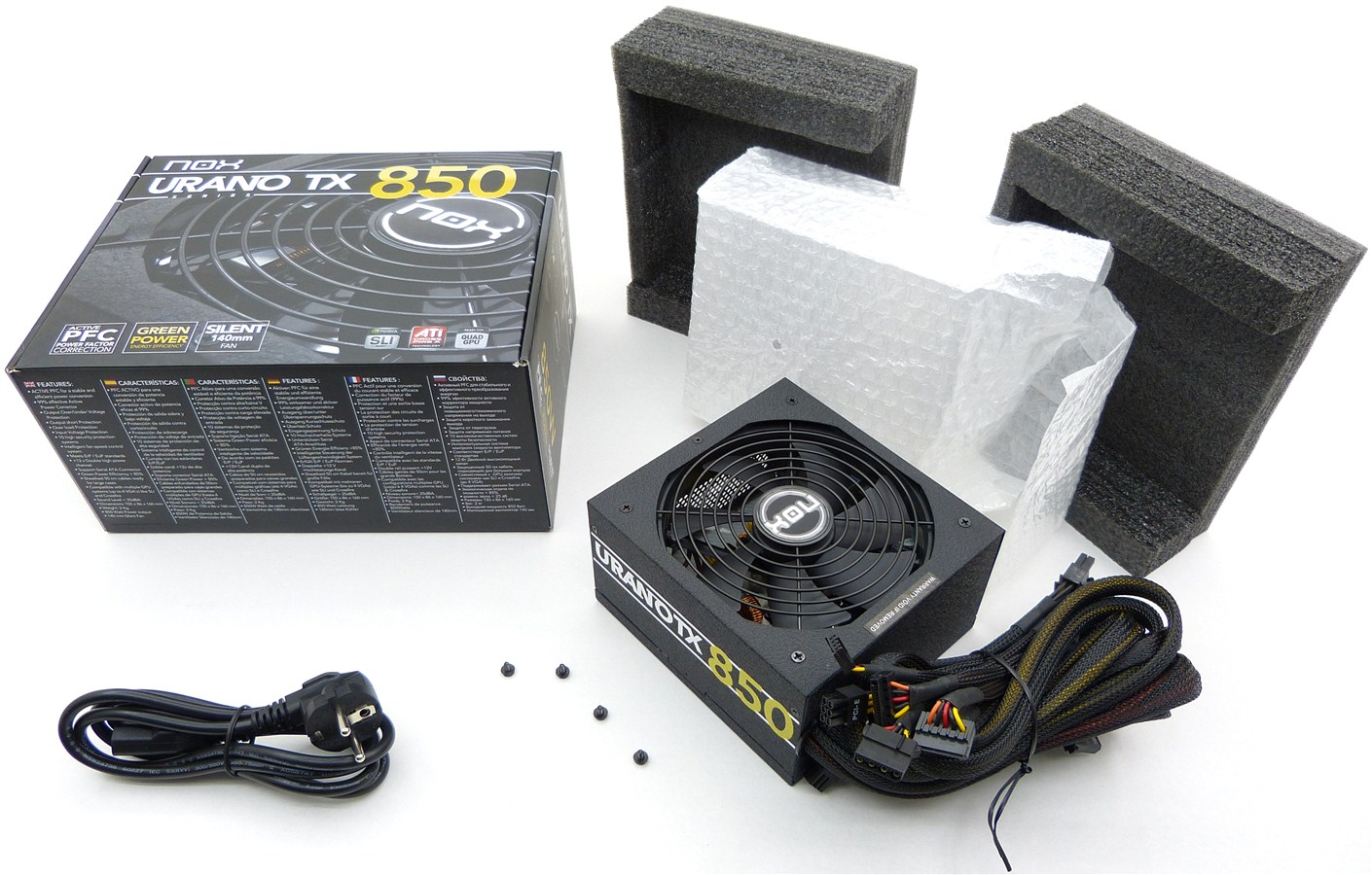 Tanto el modelo Urano VX 750 como el modelo Urano TX de 850 tienen una presentación aceptable en su embalaje, siendo superior el modelo de 850W en protecciones, algo que siempre se agradece; en este sentido es un producto ligeramente más completo que la Urano VX 750 e inferiores. El resto es lo de siempre en este nivel de gama de fuentes de alimentación, o sea, trae lo básico: un cable de alimentación de CA y sus típicos 4 tornillos de montaje (no se ha caído en el error de no suministrarlos), nada más ni falta que hace, ya que se pretende ajustar el precio lo máximo.