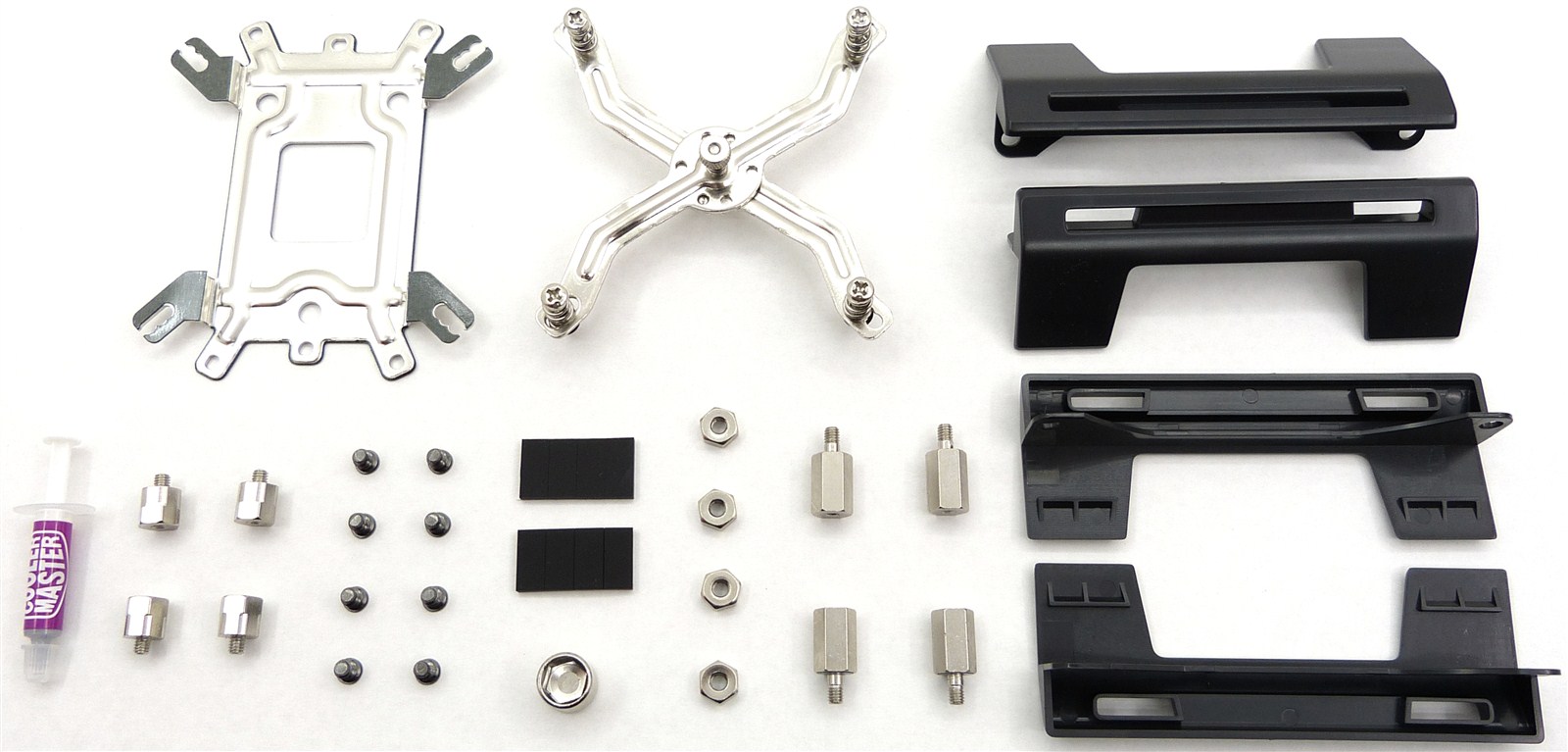 Tras abrir el embalaje nos encontramos con un excelente molde de protección para el disipador, 2 folletos de manuales para el usuario en múltiples idiomas, entre ellos el español, con claras viñetas y descripciones explicativas del montaje según el socket y una sencilla caja de cartón blanca para los accesorios, entre ellos el kit de montaje multisocket. Gracias a este kit de montaje, no es necesario emplear tanto material para los diferentes sockets. Es necesario vigilar la altura para poderse instalar en según qué torre (que ésta sea lo suficientemente ancha, como siempre). De una forma sencilla se puede armar el disipador en cualquier placa base compatible. Además de este kit y su legión de tornillería para montaje, incluye el compuesto térmico de Cooler Master, unos 3 gramos, suficientes para varias aplicaciones, una herramienta para atornillar fácilmente los tornillos de cabeza hexagonal con destornillador de punta de cruz (todo un detalle), además de 4+4 tiras de goma antivibraciones, que se podrán emplear sobre los 2 pares de montantes, de anclaje de material de plástico de color negro mate, para equipar fácilmente 2 ventiladores sobre el propio disipador. Así, se podrá optar a montar el disipador de 3 formas:
