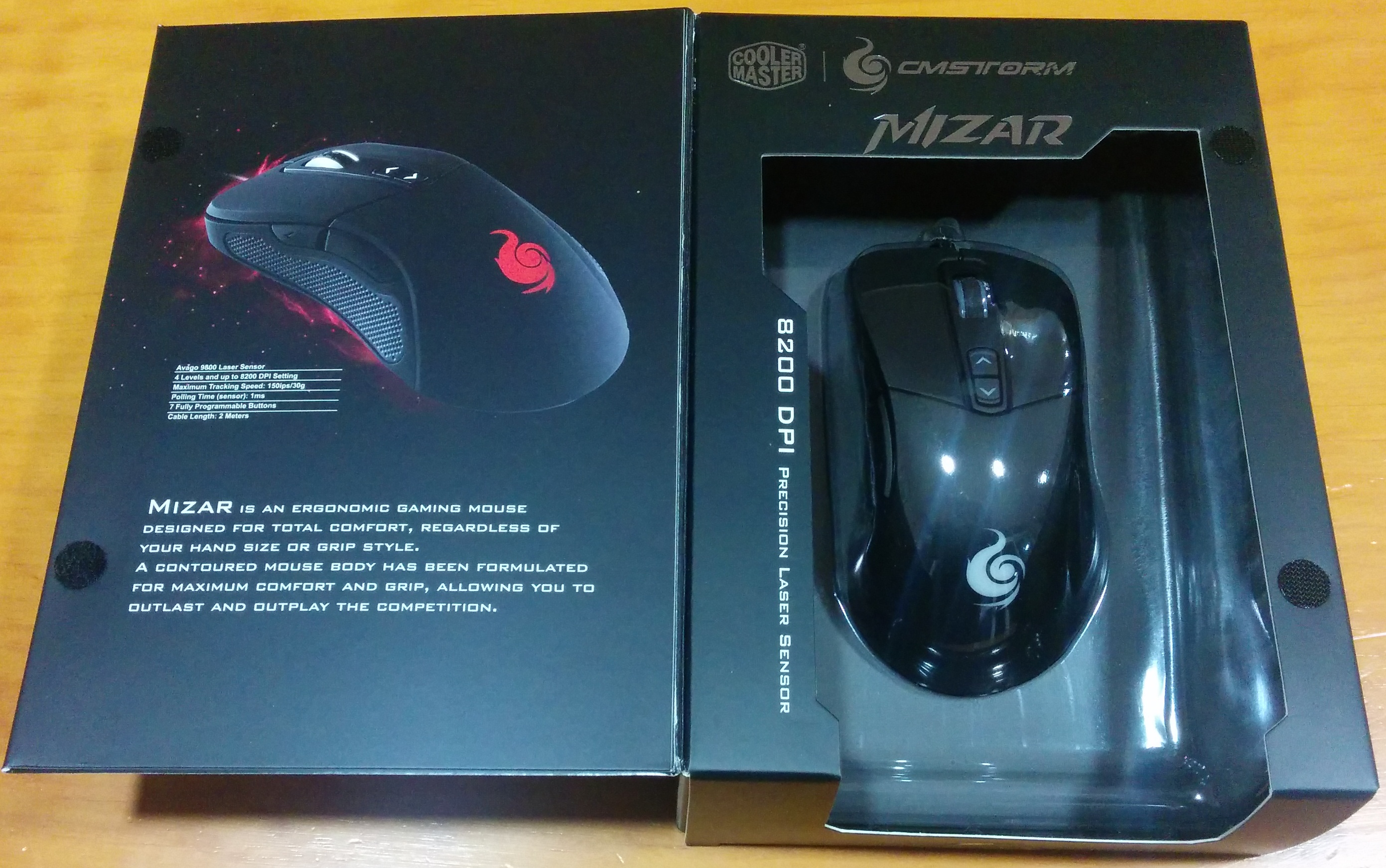 Al abrir el «libro», ya se puede ver el ratón en todo su esplendor, el cual está cubierto por una funda protectora de plástico. En la otra hoja, volvemos a ver el ratón como en el espacio en una imagen, también algunas especificaciones resumidas (sensor láser Avago 9800, 4 configuraciones de DPI hasta 8200, 150ips de velocidad de seguimiento, rango de uso de 1ms, 7 botones programables y cable de 2 metros de largarie), además del texto en inglés «Mizar es un ratón gáming ergonómico para un confort total, independientemente del tamaño de su mano y de la forma de agarre. Ha sido formulado un cuerpo contorneado para un máximo confort y agarre, lo que le permite durar más y superar la competencia.»