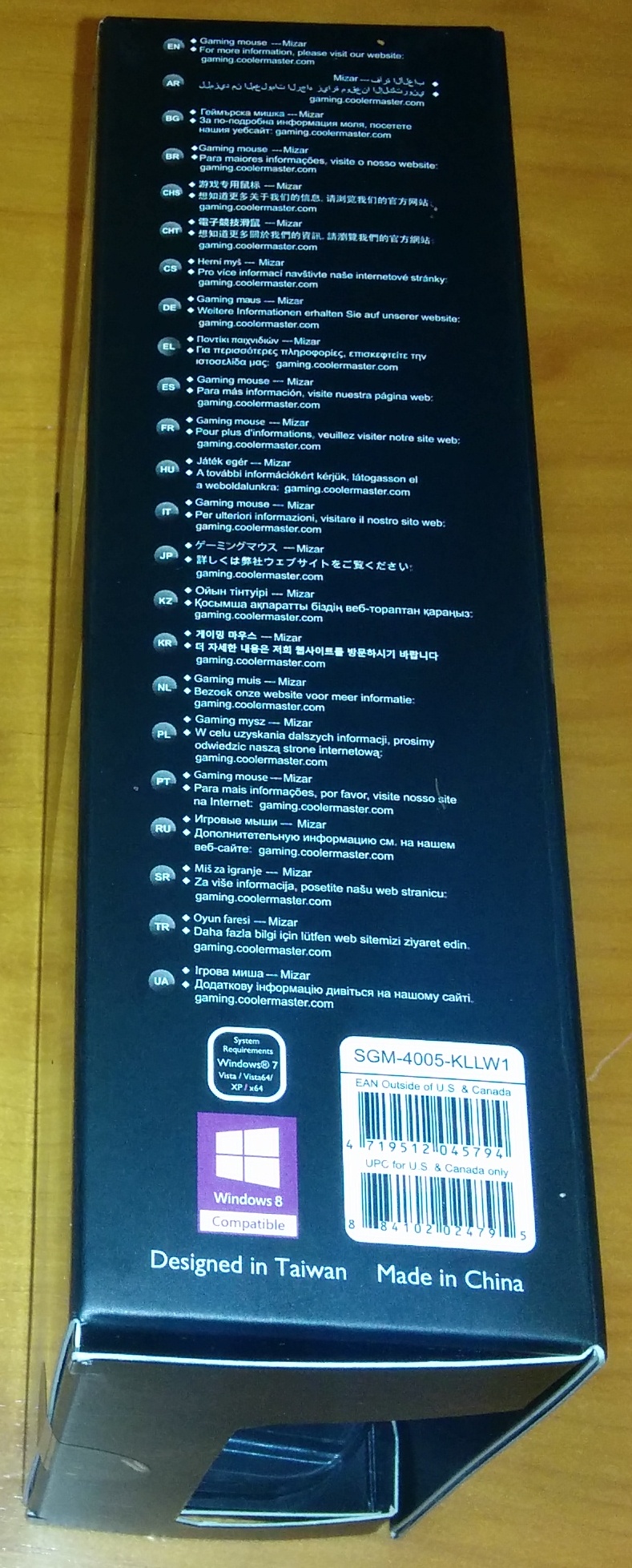 Por los laterales únicamente tiene serigrafiado el modelo del ratón gaming, el logo y los datos de la compañía, así como en varios idiomas el modelo del ratón gaming y que se puede encontrar toda su información en la web coolermaster.com