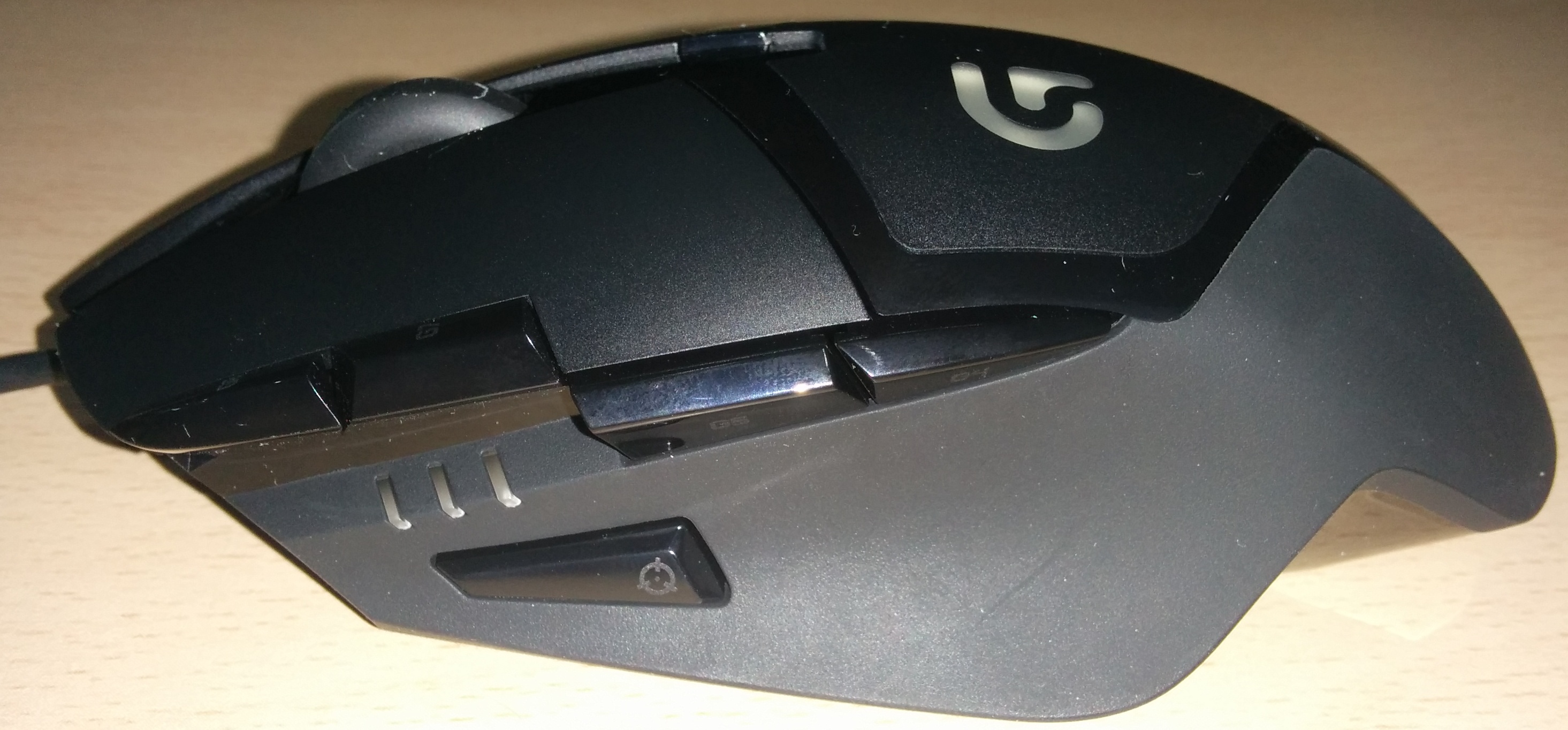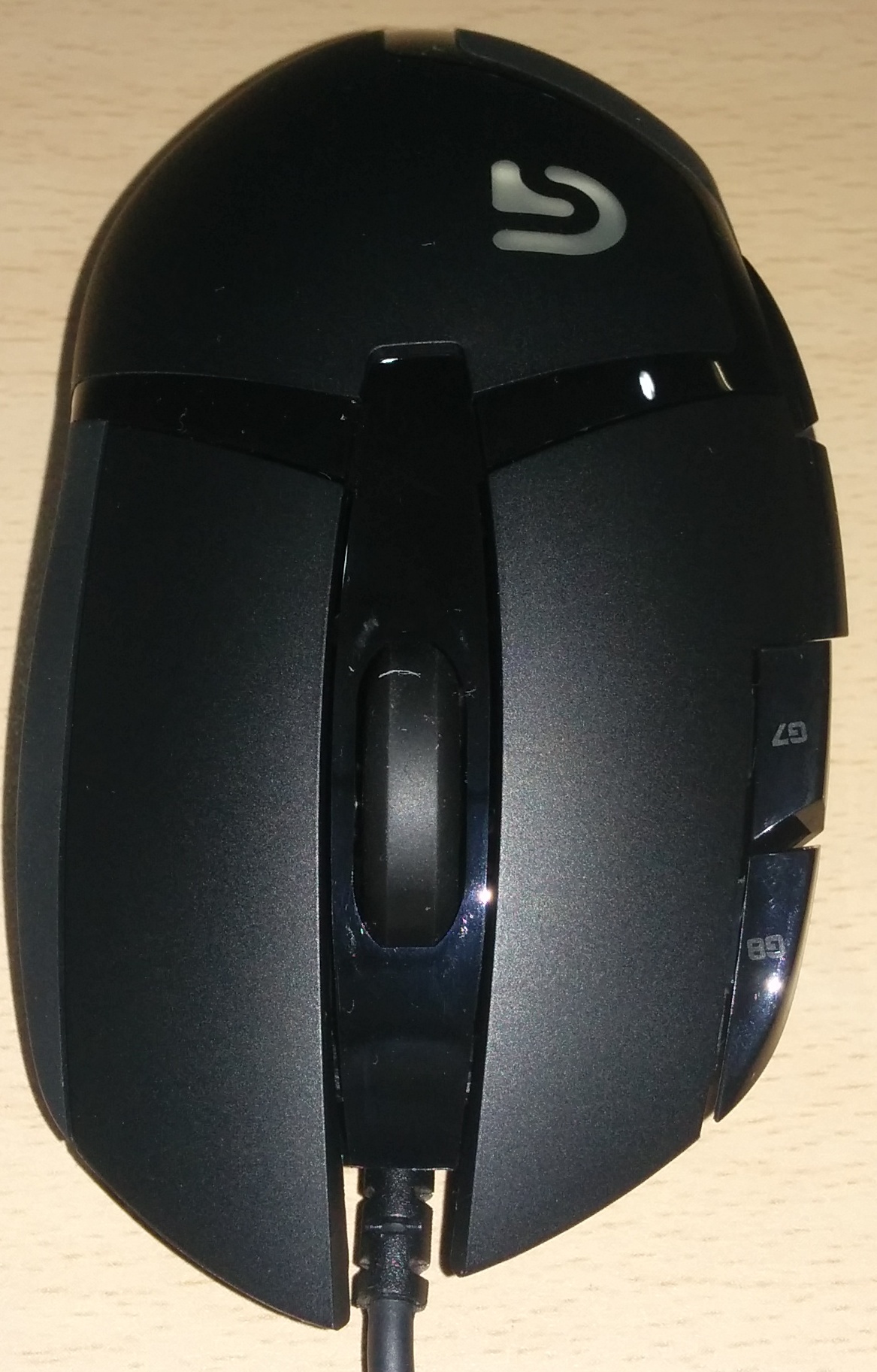 Si nos fijamos más de cerca al ratón Logitech G402, podemos observar como este tiene un diseño ergonómico, fabricando con materiales muy resistentes y orientado prácticamente para usuarios diestros, teniendo los diferentes controles que trae ubicados en la parte izquierda del ratón. En la parte de arriba del ratón nos encontramos los dos botones clásicos de toda la vida, los cuales tienen una suavidad muy agradable; también trae la rueda de desplazamiento recubierta de goma para un mayor agarre; dos botones pegados al botón izquierdo clásico, con los nombres G7 y G8, que sirven para bajar o subir de DPI mientras el usuario está jugando, pudiéndolo hacer de una manera cómoda y rápida; y el logotipo retroiluminado distintivo de la marca «G».