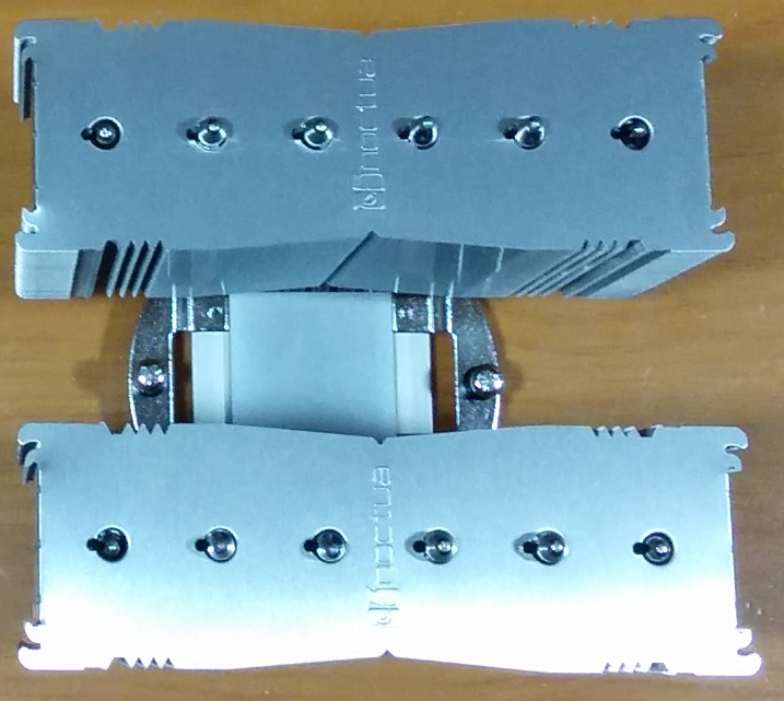 Gracias al sistema de amarre empleado por alambres y a la configuración del corte de cada lámina se permite regular en altura ambos ventiladores. De modo que si se encuentra con un problema de montaje por algún disipador u otro elemento que bordee al NH-D15, como los disipadores de la memoria RAM, se puede regular la altura de cada ventilador, sobre todo el colocado en el frontal.