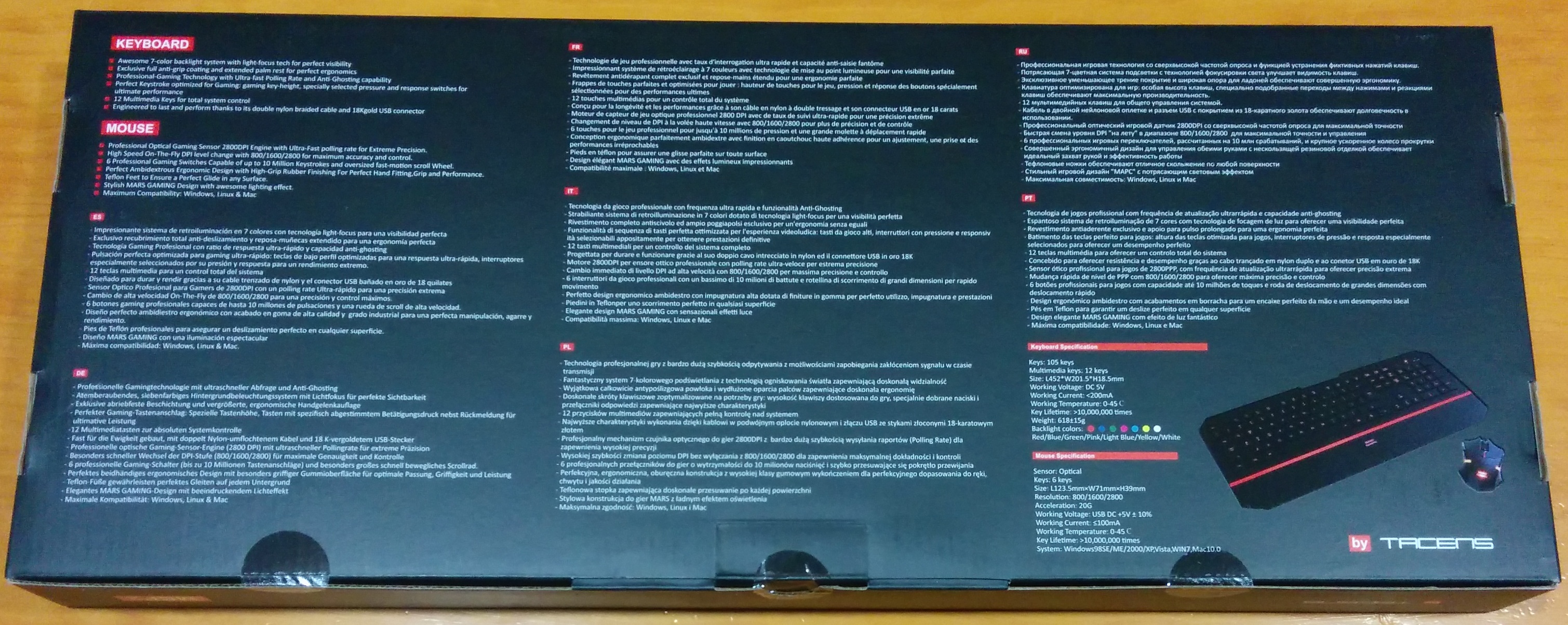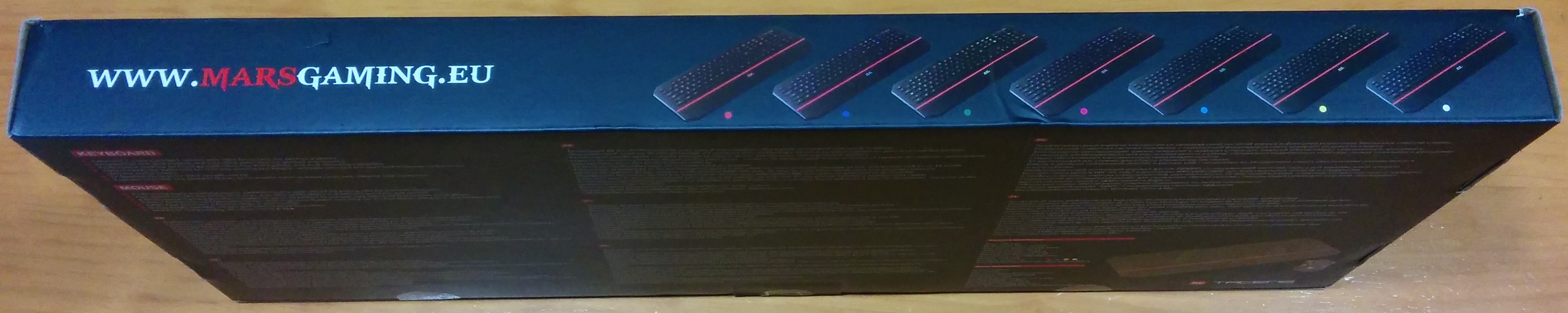 Por los laterales aparece de nuevo el nombre del combo y el fabricante, que como bien sabéis es Tacens, así como que la página web de la marca (www.marsgaming.eu) y en fotos pequeñas, todos los diferentes colores de retroiluminación del teclado.