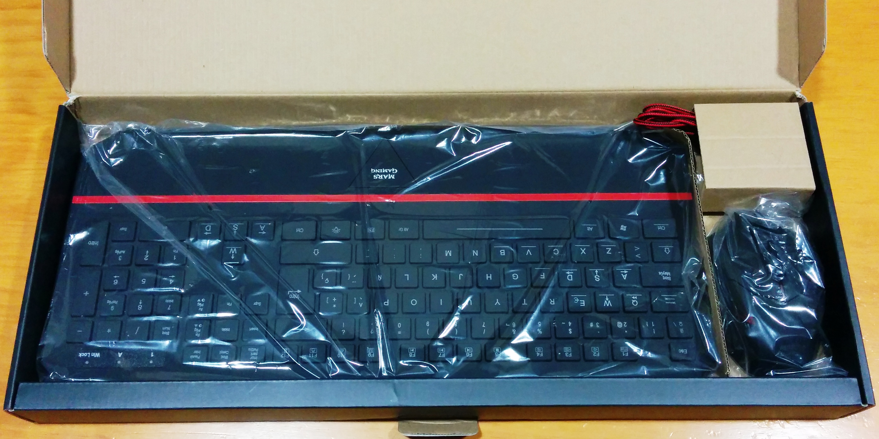 Nada más abrir la caja, vemos como viene perfectamente el teclado cubierto por un plástico transparente para evitar el polvo, además del ratón en la parte derecha de la caja, éste también cubierto por la bolsa de plástico, mientras que los cables de ambos dispositivos quedan guardados debajo de compartimentos de cartón.
