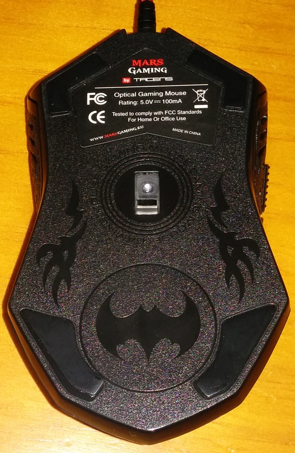 En la parte de abajo del ratón del MCP2 vemos el sensor óptico profesional que brinda resoluciones de 800, 1600 y 2800 DPI, los pies de teflón profesionales en los extremos para asegurar un deslizamiento perfecto en cualquier superficie, y algunas serigrafías con formas de tribales en los extremos laterales, y de murciélago en el inferior.