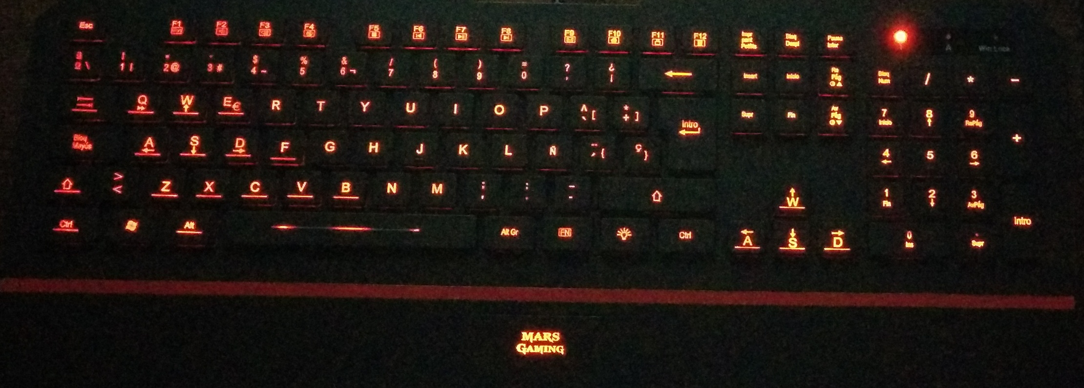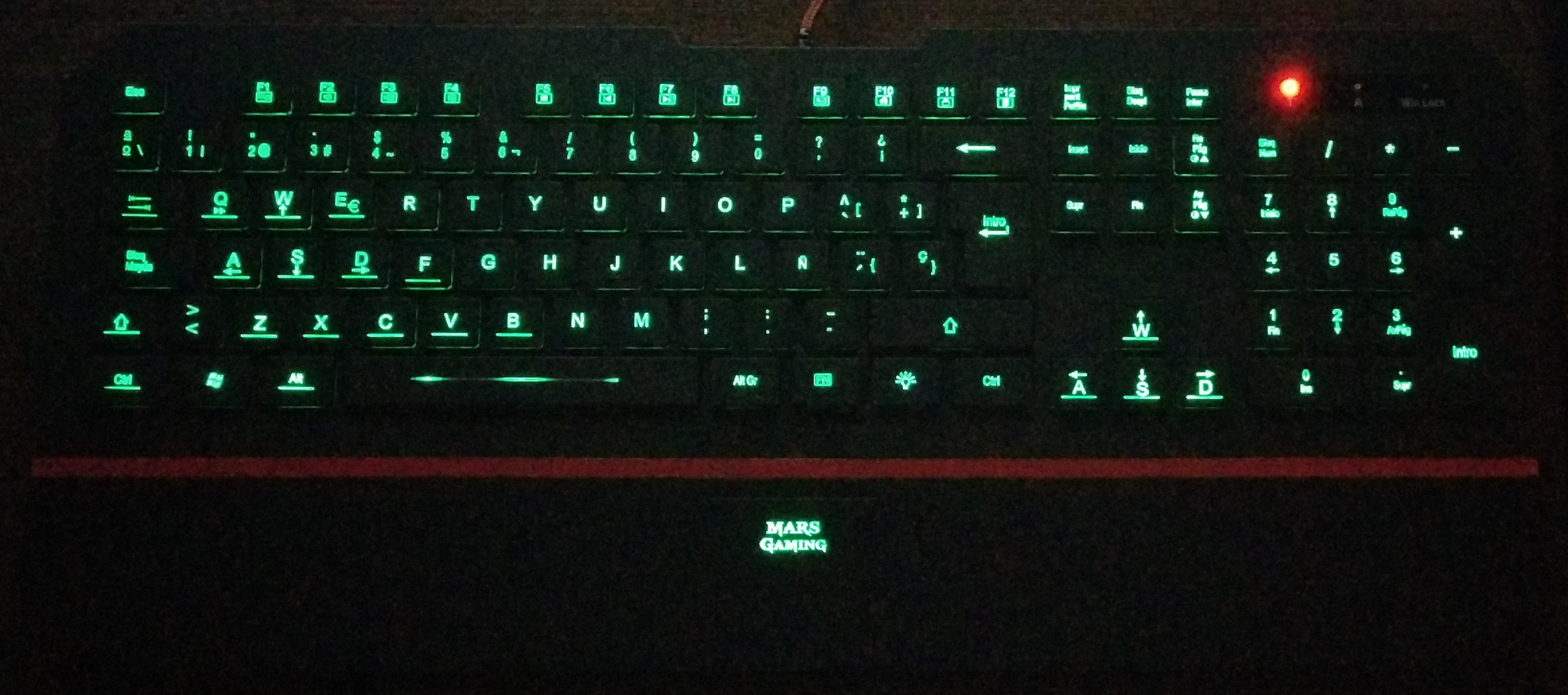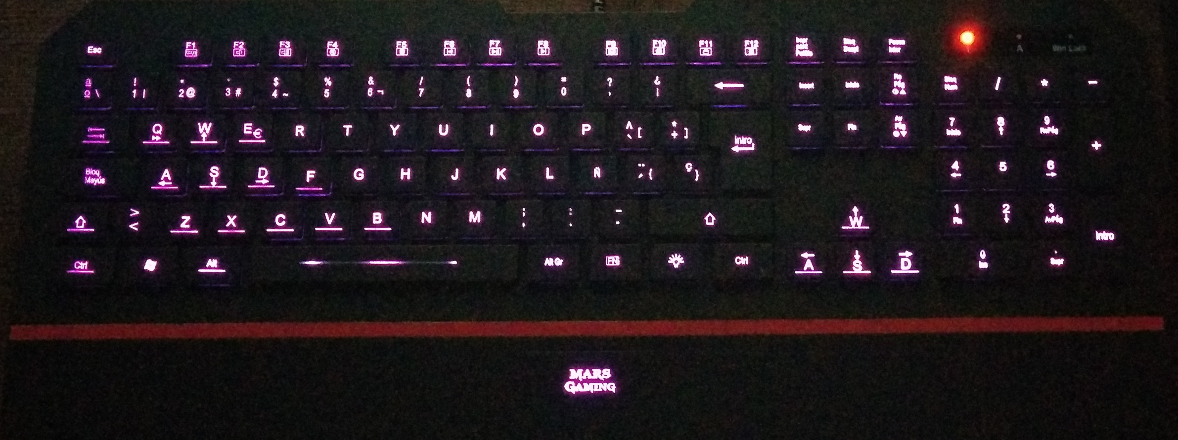 El teclado del combo MCP2 de Mars Gaming, marca de Tacens, tiene un sistema de retroiluminación en 7 colores con tecnología light-focus para una visibilidad perfecta. Estos colores se pueden cambiar pulsando una tecla específica que se encuentra en el lado derecho de la barra espaciadora, como ya comentamos anteriormente, y dichos colores son los siguientes: Rojo, azul fuerte, verde, rosa, azul claro, amarillo y blanco. Además, tiene un modo respiración que va cambiando de color dándole a la misma combinación de teclas de cambio de color: Fn+la tecla de iluminación de colores.