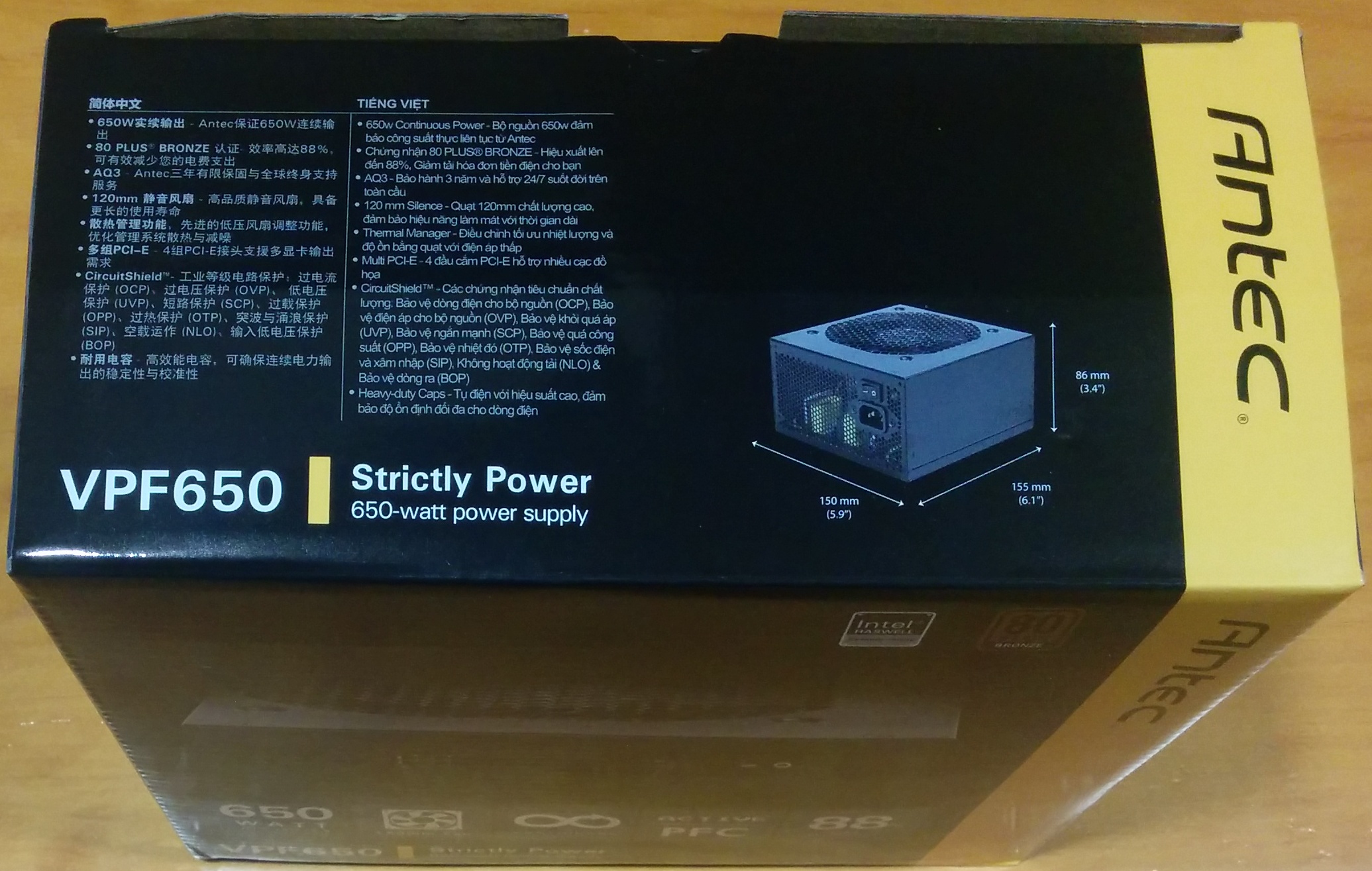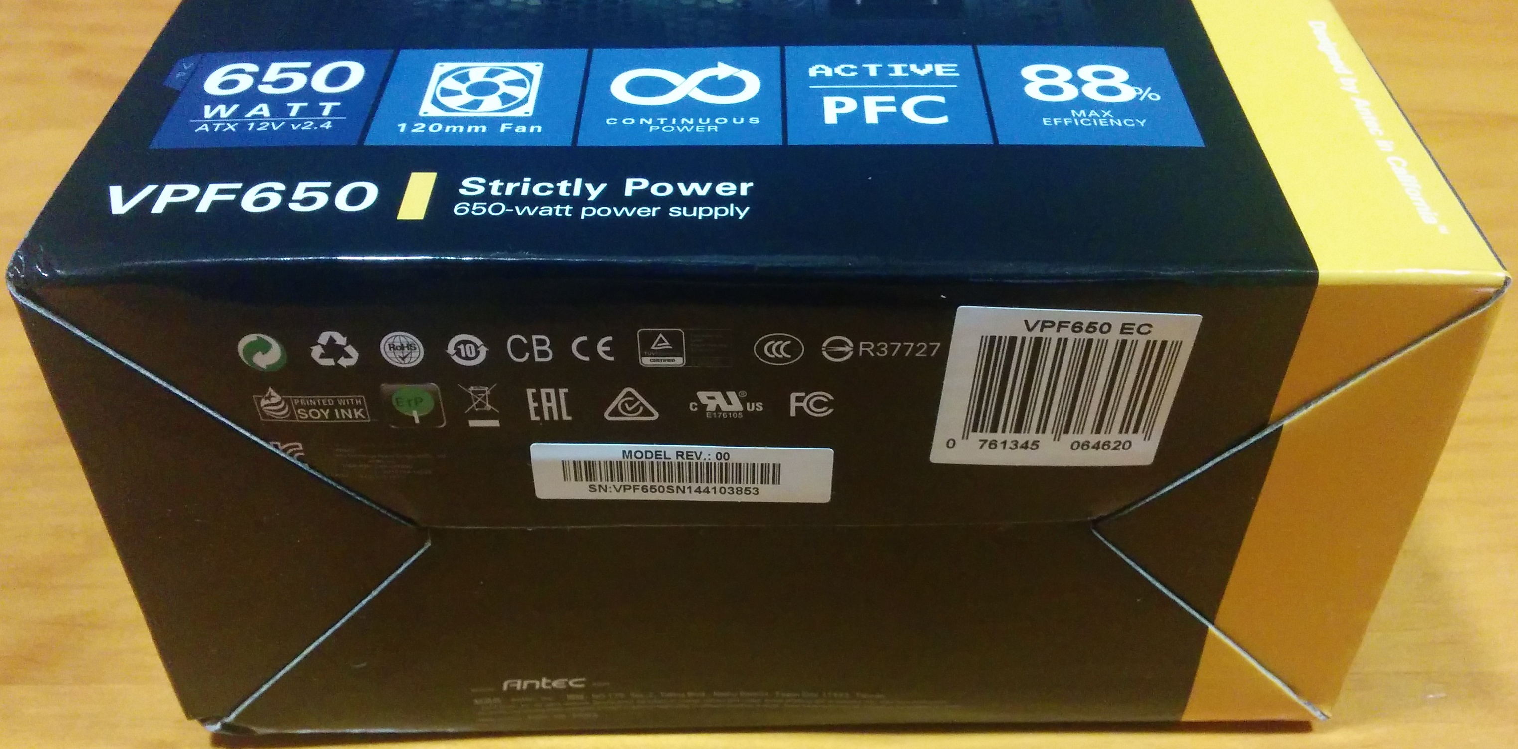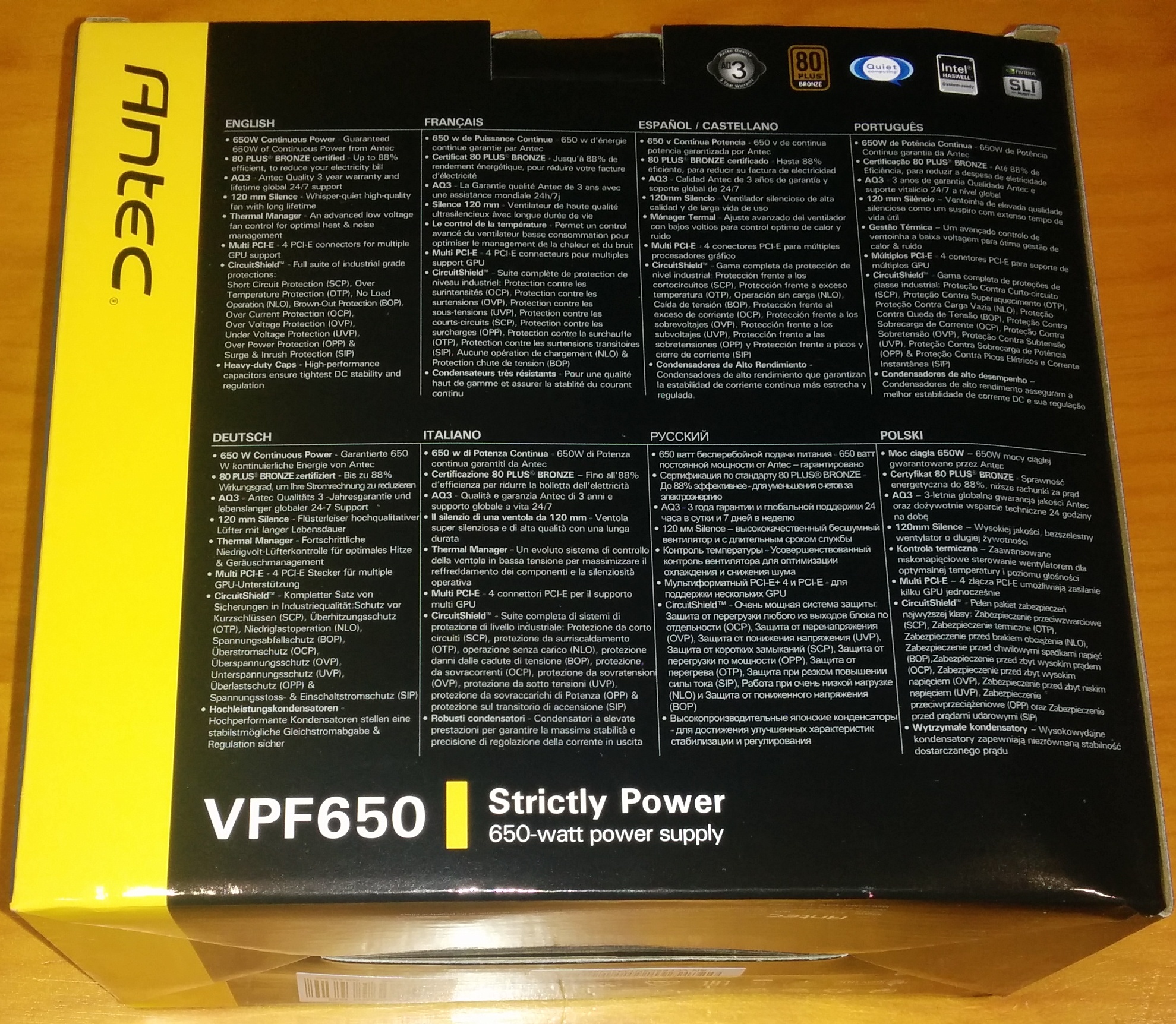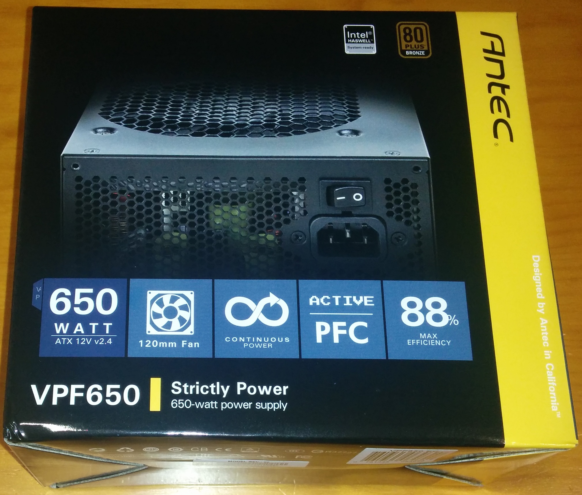 La Antec VPF650 llega en una caja de cartón de diseño tradicional jugando con colores oscuros en casi toda la caja excepto la franja amarilla en el extremo derecho, distintivos de la marca. En la parte principal, Antec deja ver un poco la fuente de alimentación que alberga en su interior, y algunas características destacables: potencia de 650 vatios, que contiene un ventilador de 120 mm, ofrece corriente continua, PFC Active, certificado 80 Plus bronce que proporciona hasta 88% de eficiencia, y soporte para procesadores Intel Haswell.