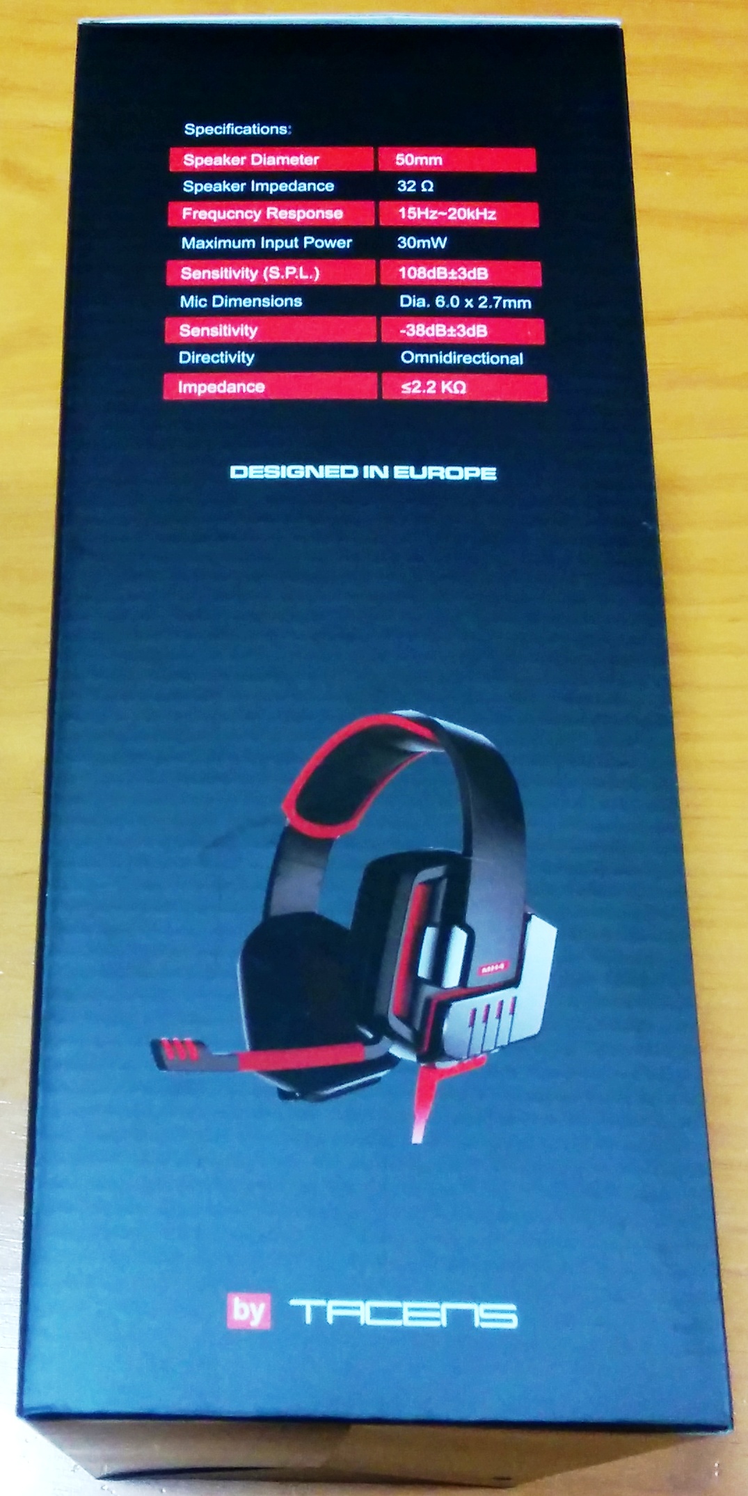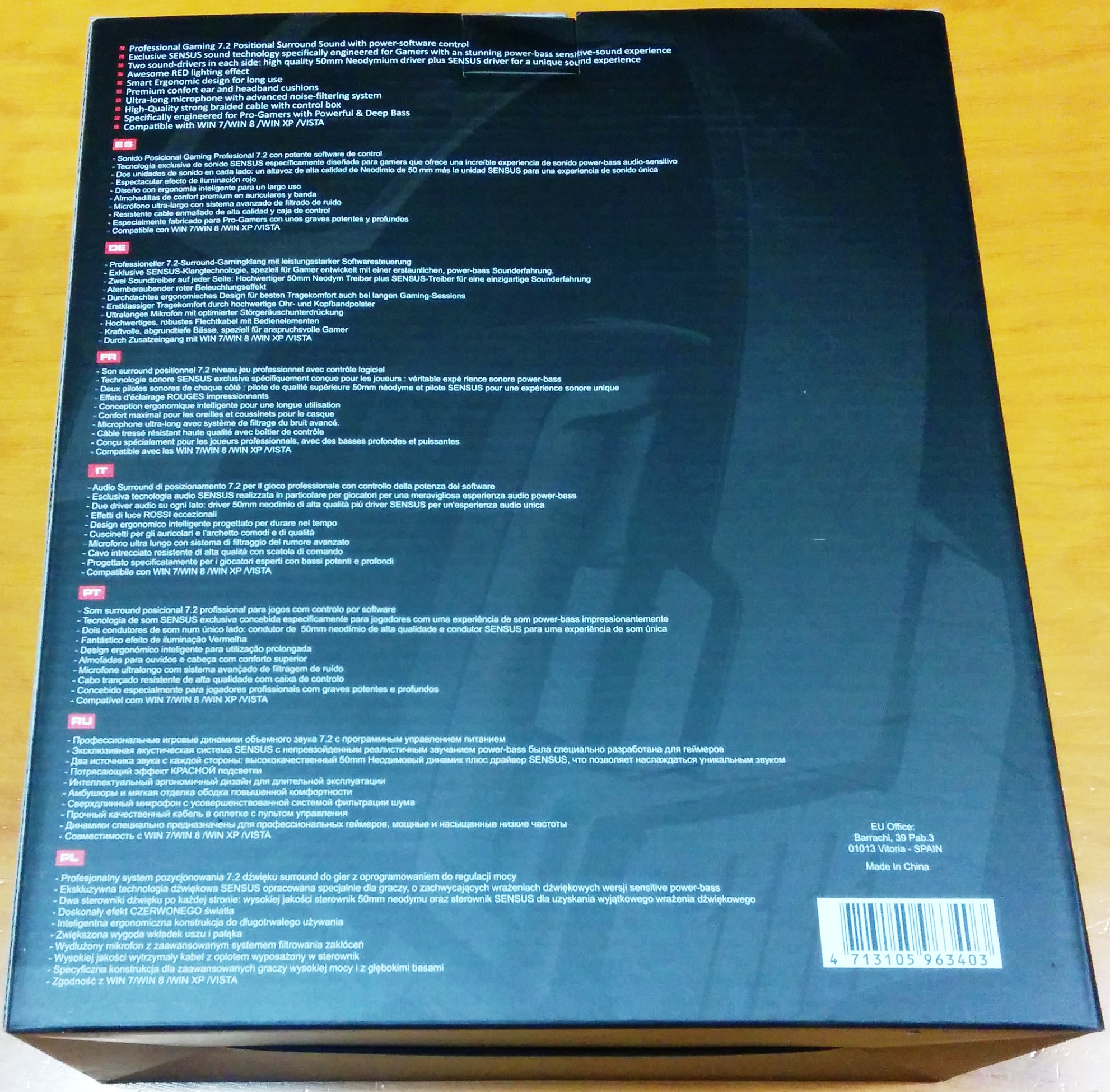 En la parte frontal, la marca quiere destacar que se tratan de unos cascos gaming 7.2 Positional Surround Sound con tecnología Sensus, y en un gris claro está ilustrado de fondo un boceto de los propios auriculares.