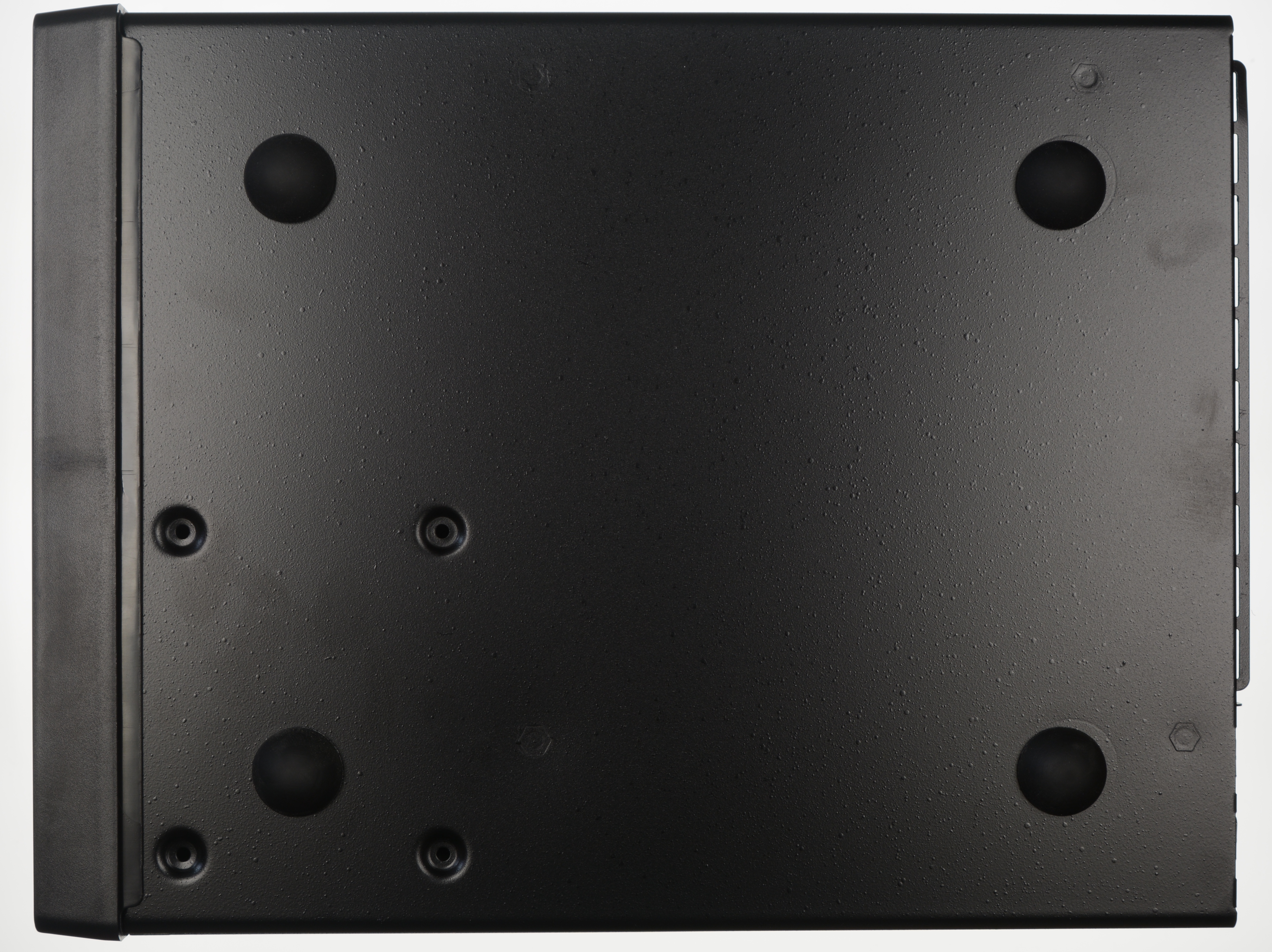 Toda la parte de abajo de la carcasa es completamente lisa, y lleva las cuatro patas de goma y cuatro orificios para poder poner una unidad de almacenamiento de 2.5 pulgadas sobre la base.