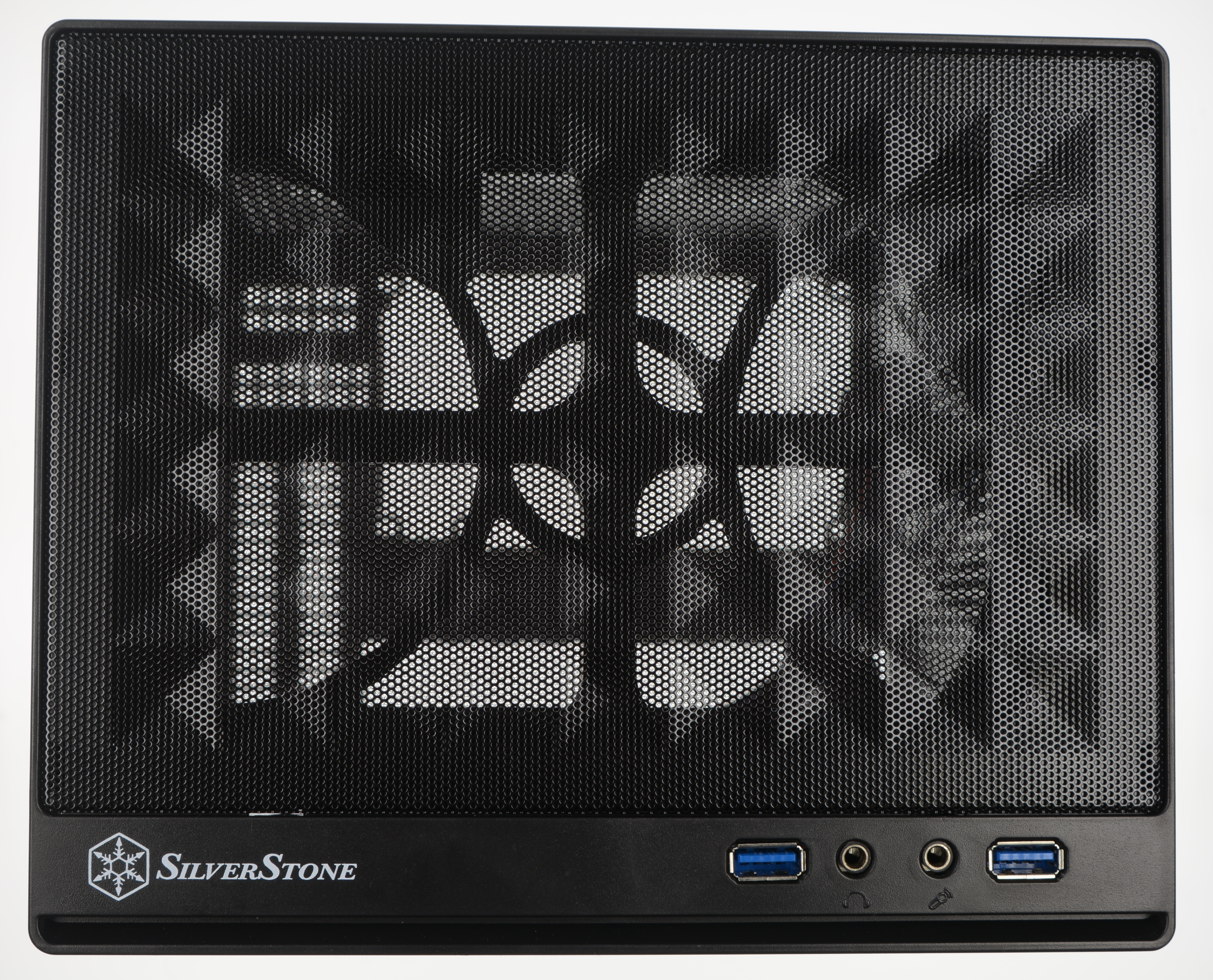 La parte frontal es prácticamente toda una rejilla perforada que ayuda a estar mejor ventilada, además de poder poner un ventilador de 12 o 14 centímetros en su interior para mantener más fresco los componentes instalados. También proporciona dos puertos USB 3.0, salida de audio y entrada para el micrófono.