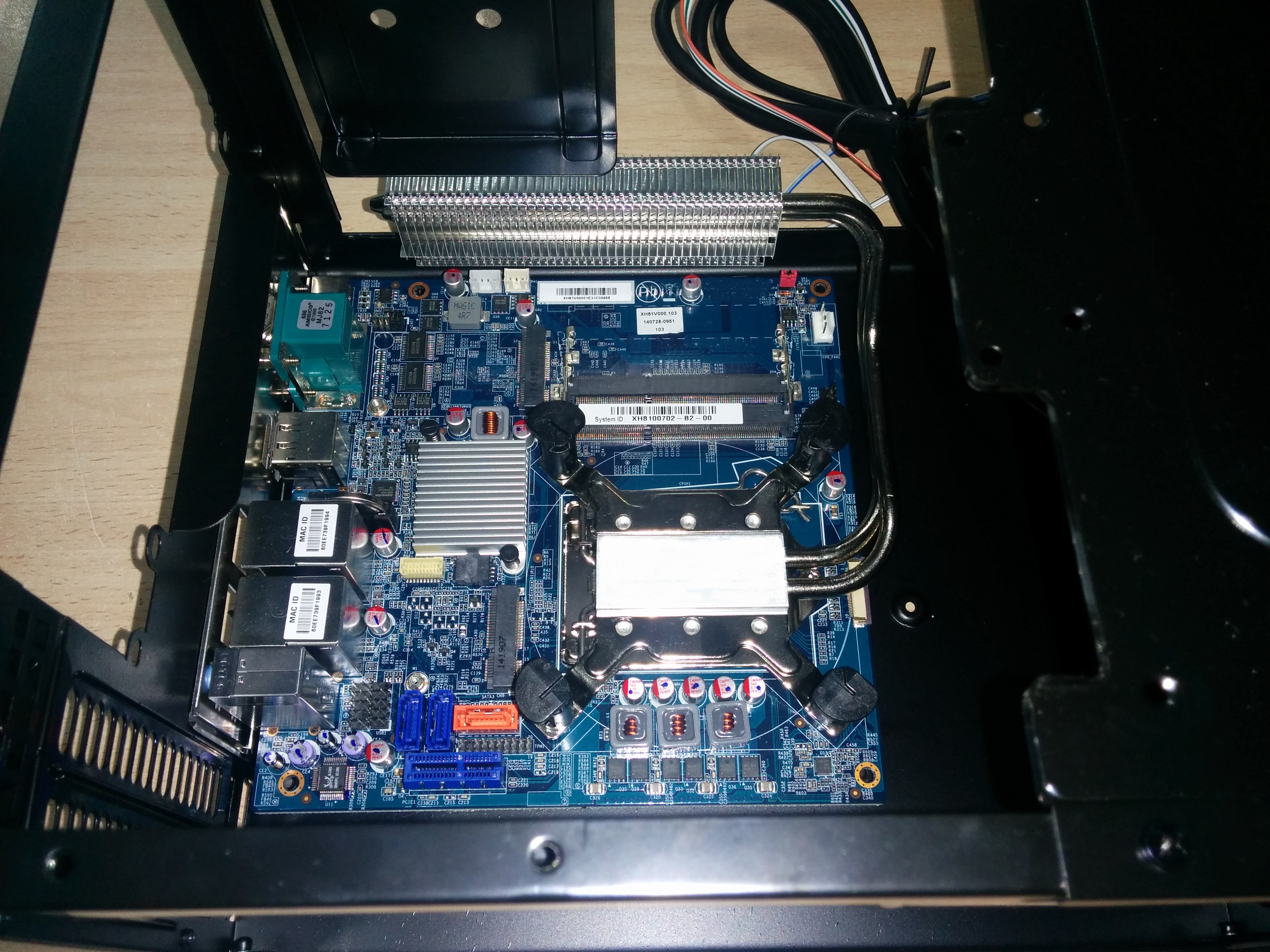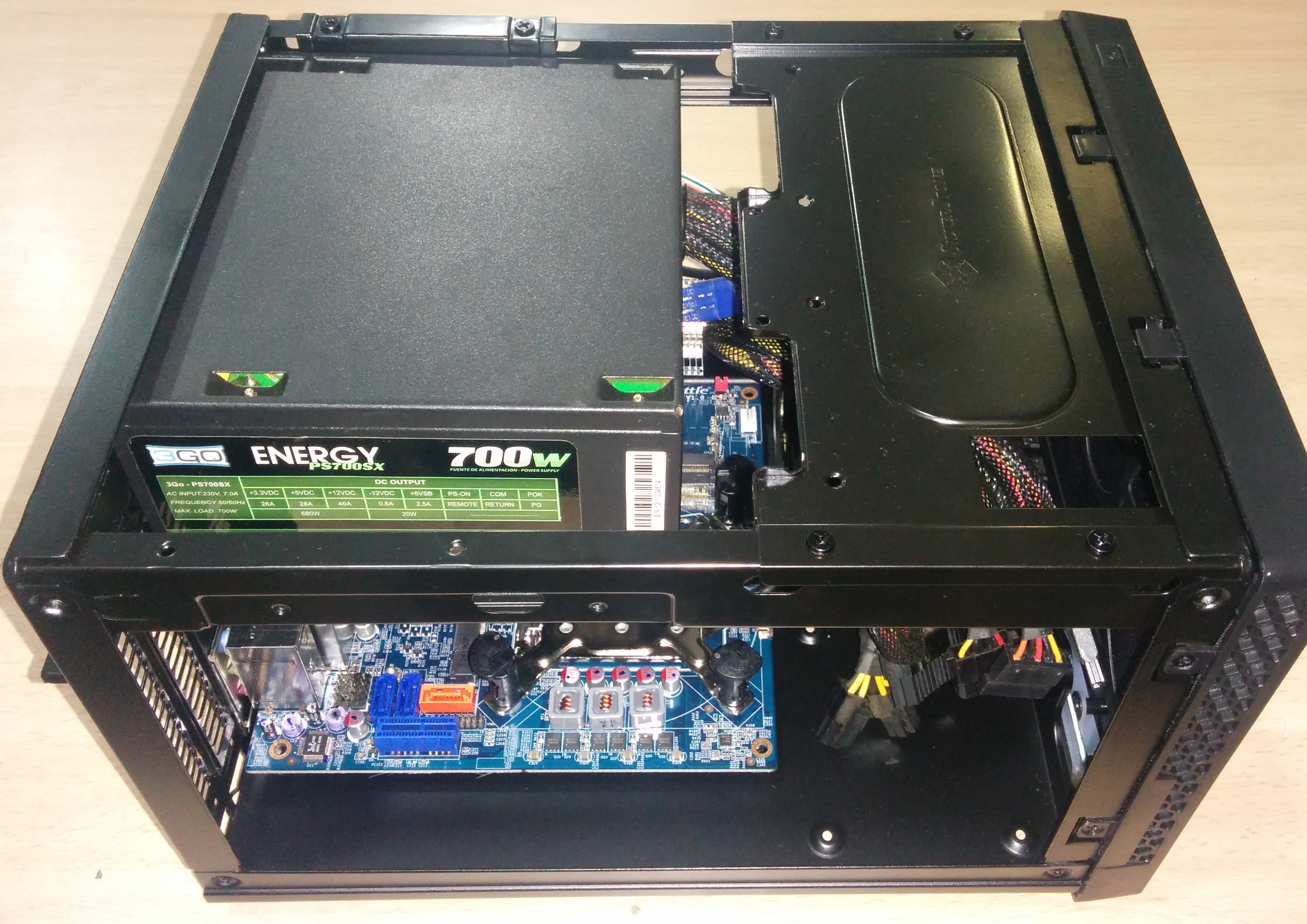 Y, por último, quedaría instalar la tarjeta gráfica en el lateral. Nosotros la hemos puesto provisional ya que la placa base que hemos utilizado no tiene slot PCI-E de x16, pero de esta manera podéis comprobar cómo quedaría el sistema ya todo montado.
