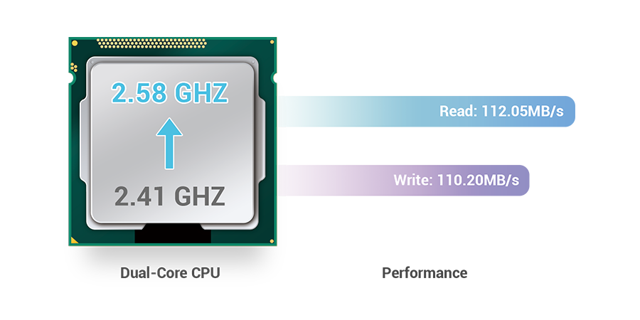 El NAS AS5002T de Asustor viene potenciado por un procesador de doble núcleo Intel Celeron que trabaja a 2.41GHz, aunque se puede aumentar hasta 2.58GHz. Al mismo tiempo, se incluye una memoria RAM DDR3L de 1GB a 1600MHz, y es ampliable hasta un máximo de 8GB a través de los dos slots que cuenta la placa base. Por lo que si en algún momento necesitas más rendimiento, es una solución fácil de obtener. Pero, para ver todos los detalles técnicos, echa un vistazo a continuación.