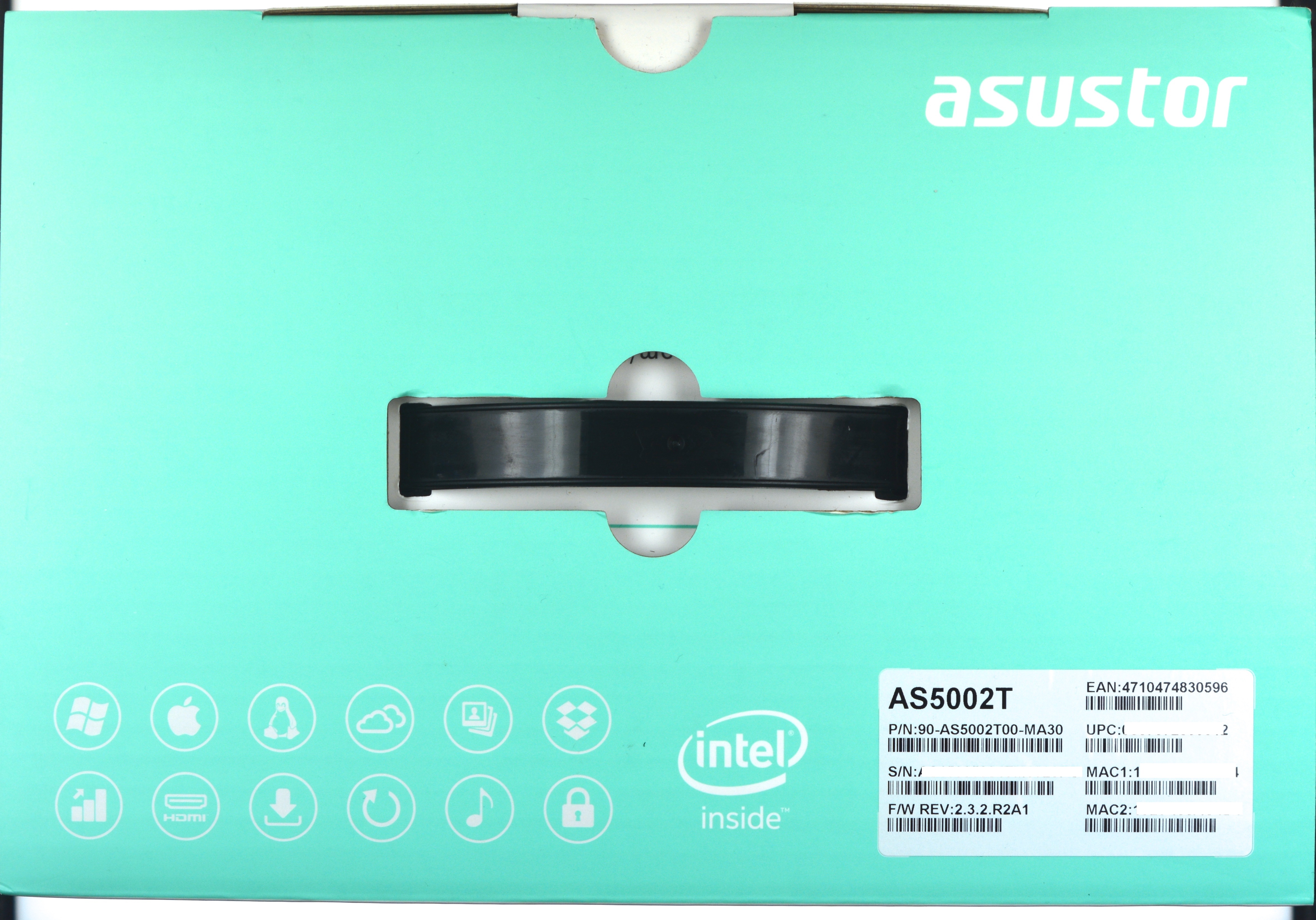 En la parte superior de color verde, se muestra el logotipo ASUSTOR de la compañía, de nuevo algunos iconos que identifican las propiedades del NAS, el logotipo de Intel Inside, un conjunto de códigos de identificación del producto con la revisión de firmware con la que la unidad es distribuida, y la asa de mano para poder ser transportado con mucha comodidad.