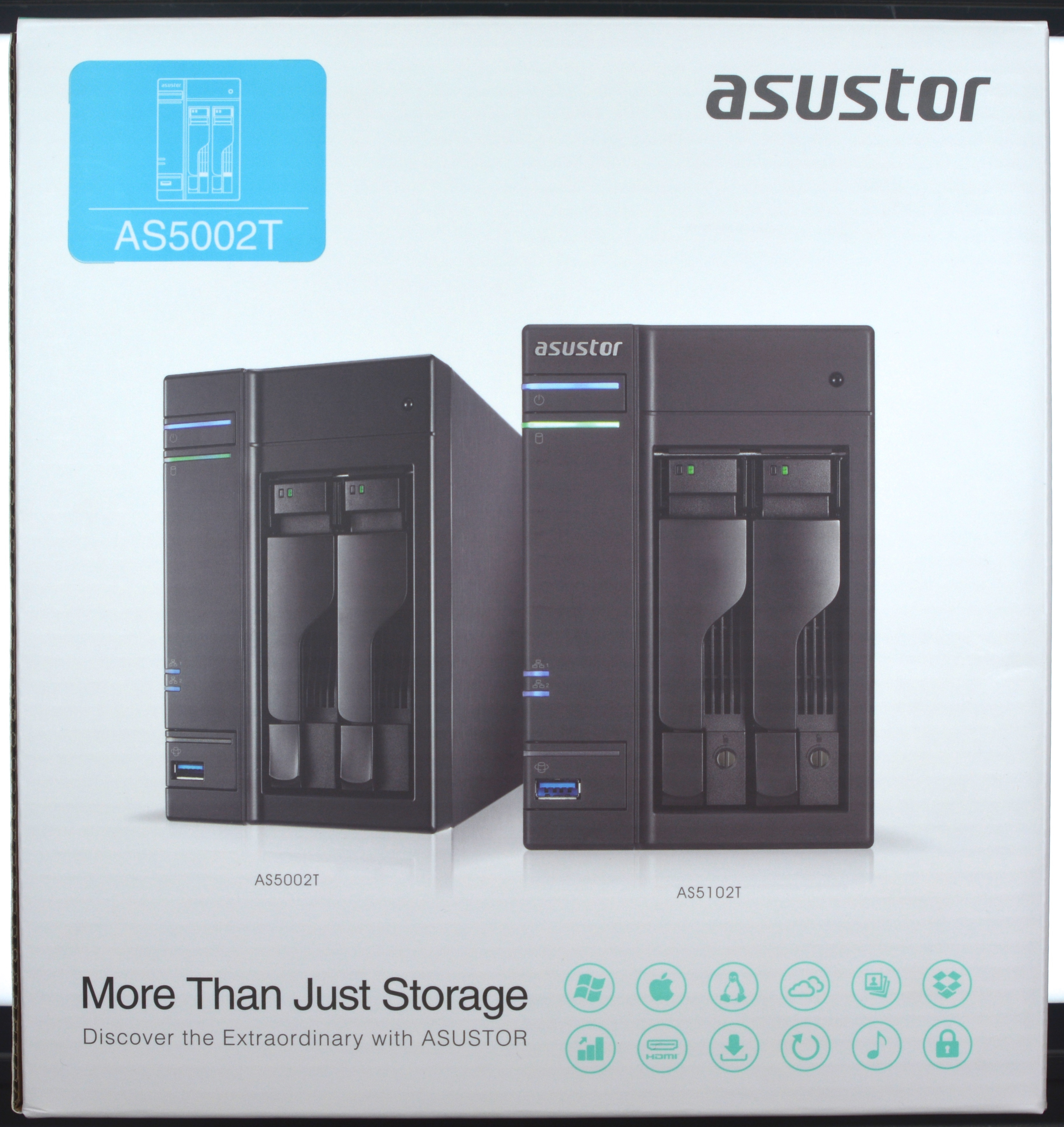 El NAS viene en una compacta caja de cartón de color blanca que está repleta de información para que el consumidor pueda saber todas sus características resumidas antes de poderlo adquirir. En la parte frontal de la caja, aparte de ver en una imagen los dos modelos de la serie 5, el AS5002T y AS5102T, Asustor señala de que que trata de algo más que un solo dispositivo de almacenamiento, con los logos de Windows, Mac, Linux, la nube, la música, fotos, HDMI, descargas, etc., que hacen referencia a sus soportes y algunas de sus funciones que permite el servidor NAS.