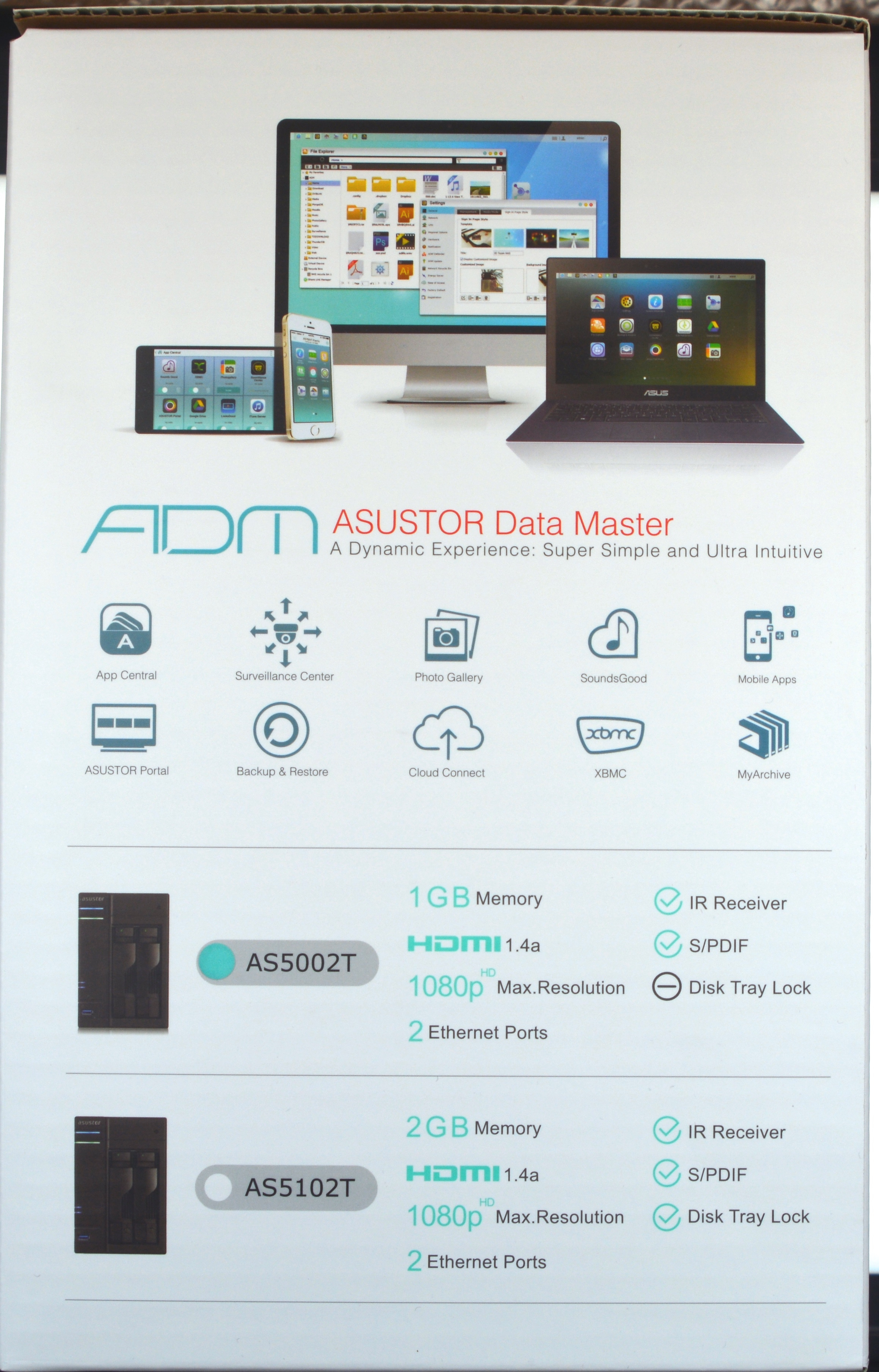 En uno de sus laterales se informa del sistema operativo ADM (Asustor Data Master) y sus principales aplicaciones (App Central, Surveillance Center, Photo Gallery, SoundsGood, Mobile Apps, Asustor Portal, Backup & Restore, Cloud Connect, XBMC y MyArchive), así como las especificaciones del modelo incluidos en el paquete, que en este caso es el AS5002T, que viene etiquetado con una pegatina redonda de color verde, y la diferencia respecto a su hermano mayor de la serie, el AS5102T, que básicamente es que éste último cuenta con 2GB de memoria RAM y bloqueo de los discos duros, mientras que el que estamos analizando sólo cuenta con 1GB de memoria RAM y no trae el bloqueo de discos duros.
