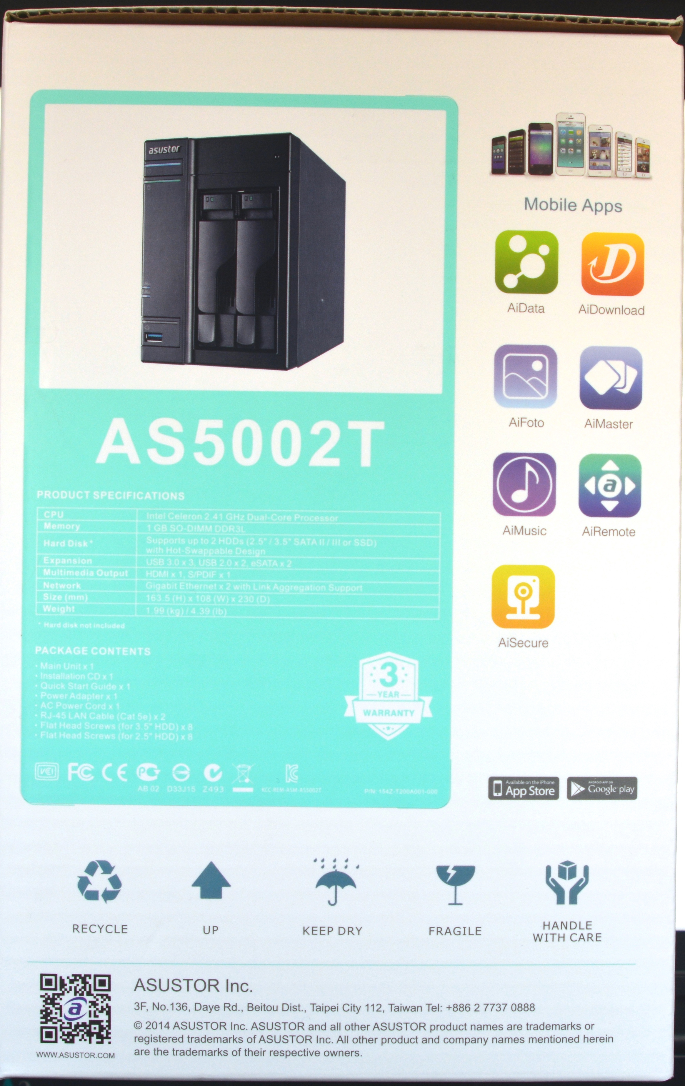 En el otro lateral se muestra de nuevo el modelo del servidor NAS con una imagen y sus especificaciones técnicas del hardware, el contenido del paquete, las principales aplicaciones móviles (AiData, AiDownload, AiFoto, AiMaster, AiMusic, AiRemote, AiSecure), las instrucciones sobre cómo manejar el embalaje para el transporte, y finalmente los datos reales de la empresa junto con su garantía de tres años.