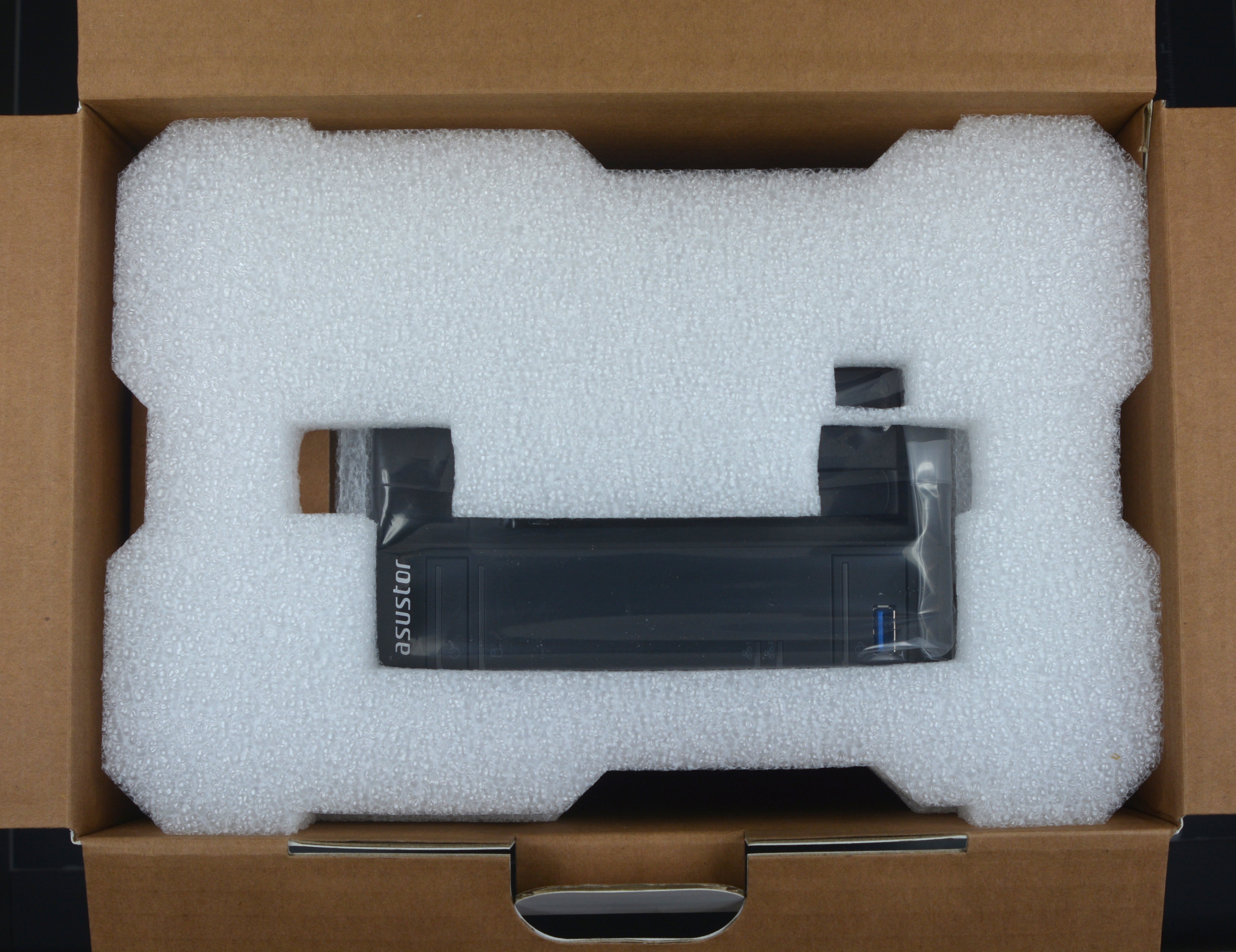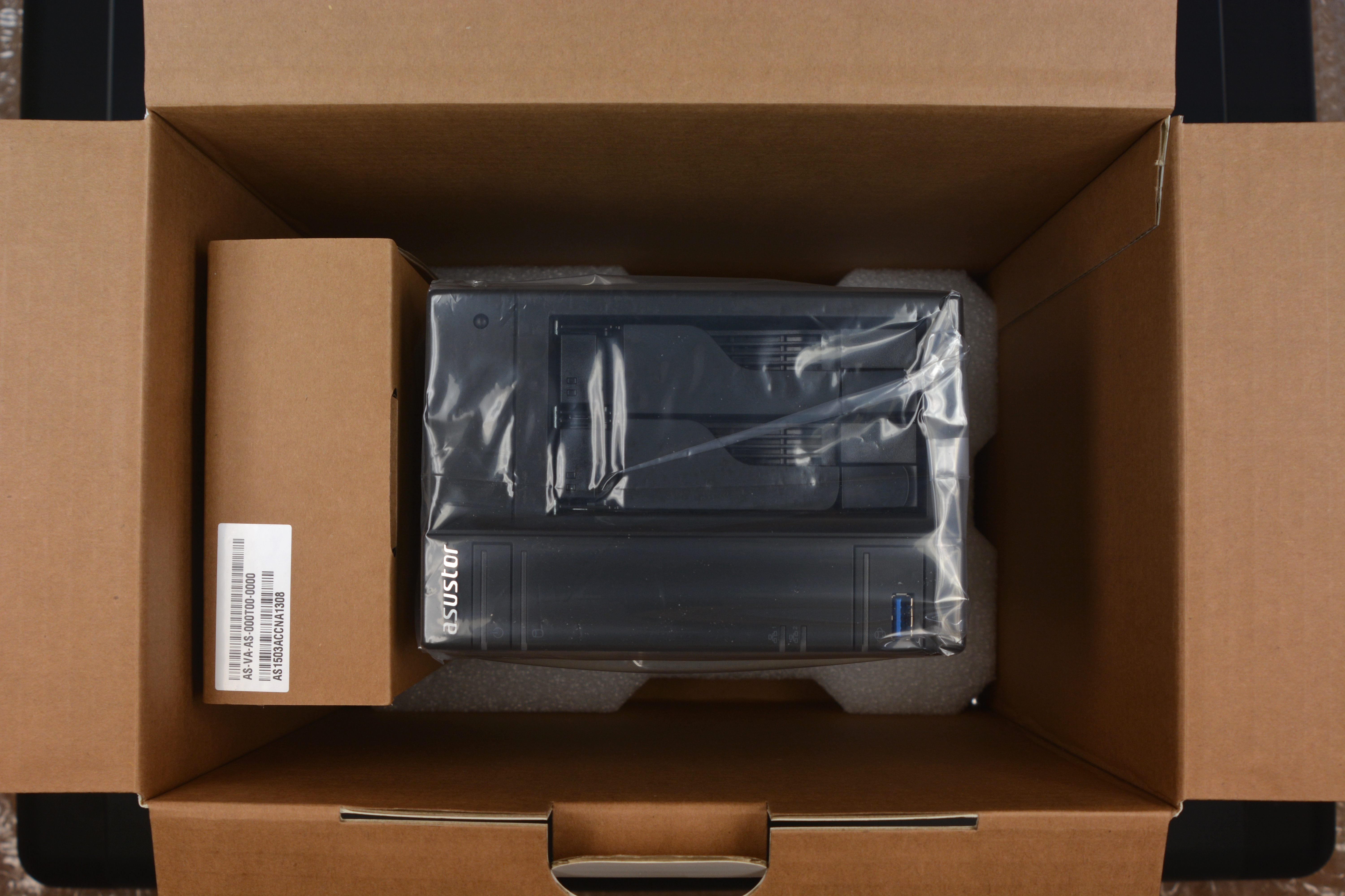 Al abrir la caja vemos como Asustor ha cuidado con precisión el empaquetado del producto, protegiéndolo adecuadamente con dos gruesas espumas de poliuretano y una bolsa de plástico transparente para evitar que el AS5002T coja polvo y posibles arañazos. También lleva dentro una caja de cartón que contiene todos los accesorios del NAS. Vamos, que viene perfectamente protegido para que llegue intacto el producto al consumidor final aunque el paquete sufra algún golpe accidental durante el transporte.