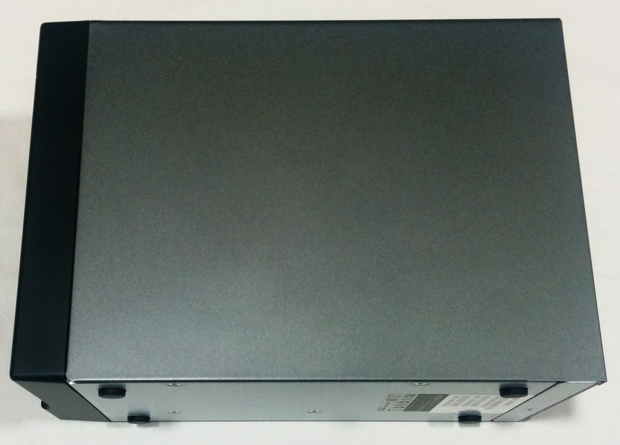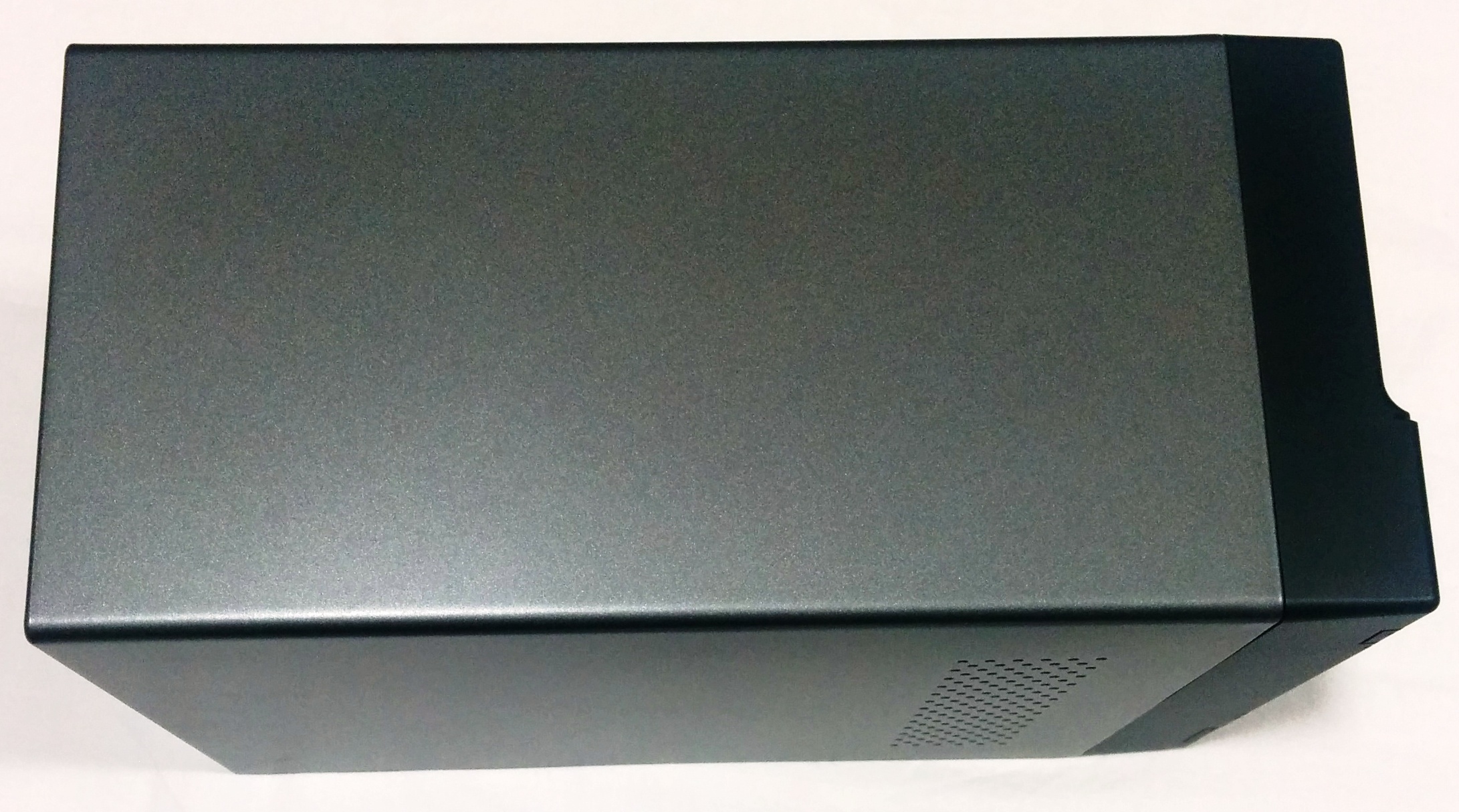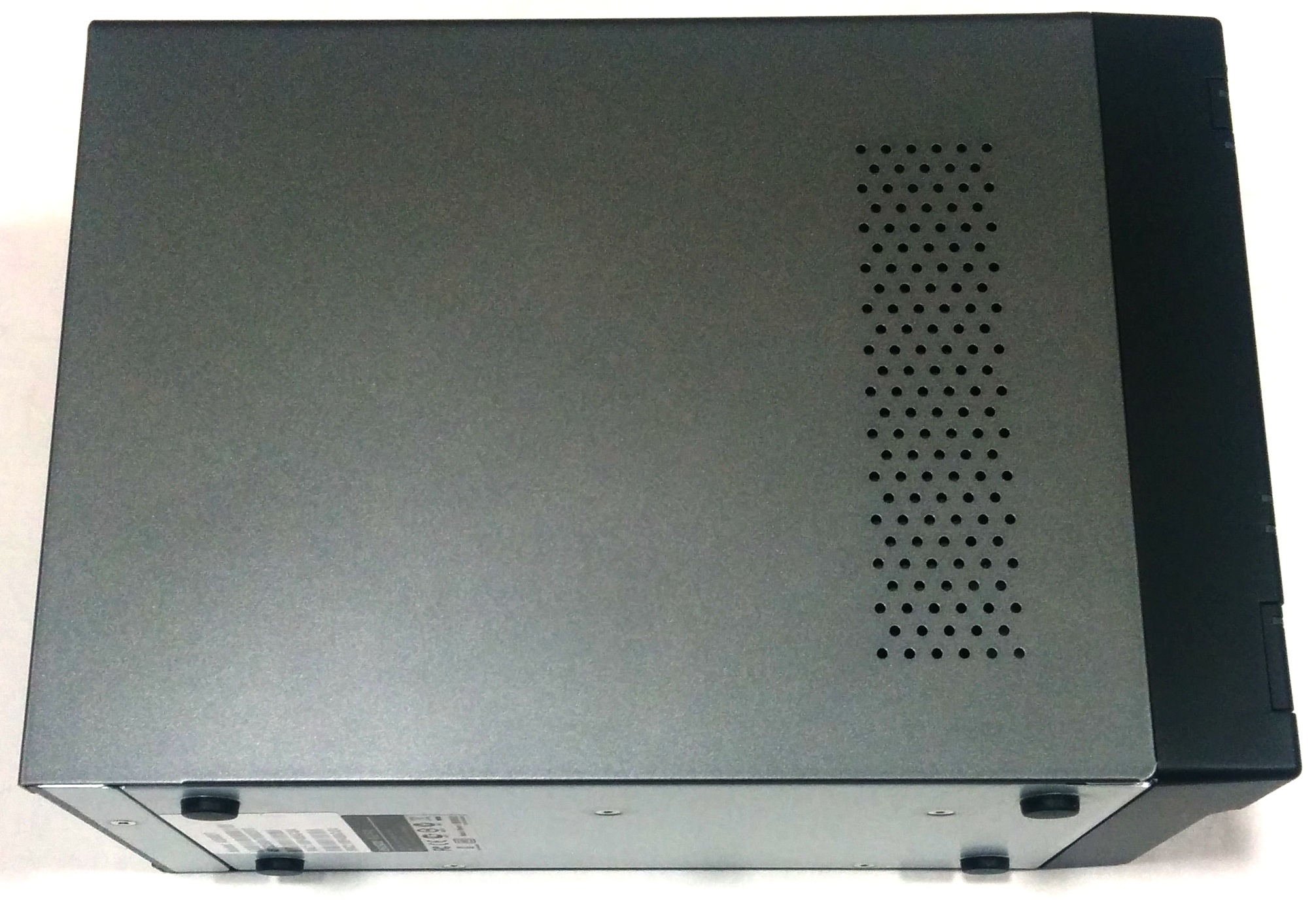 Comenzando con su apariencia externa, queda claro de que se trata de un servidor NAS con un diseño simple, robusto y elegante. Todo su chasis es de aluminio con un color gris metalizado. Pero la parte delantera está compuesta de un material de plástico negro muy resistente y duradero. En el frontal cabe destacar el botón de encendido del dispositivo, los LEDs que indican el buen funcionamiento del NAS (el encendido/apagado, funcionamiento de las unidades de almacenamiento, las interfaces LAN y la función de copiado), el puerto USB 3.0 con un botón que permite copiar directamente al servidor el contenido de un disco duro o pendrive que se conecte a dicho USB, un sensor de infrarrojos en la parte superior-derecha para el mando a distancia opcional, y las dos bandejas extraíbles para el intercambio de discos duros en caliente.