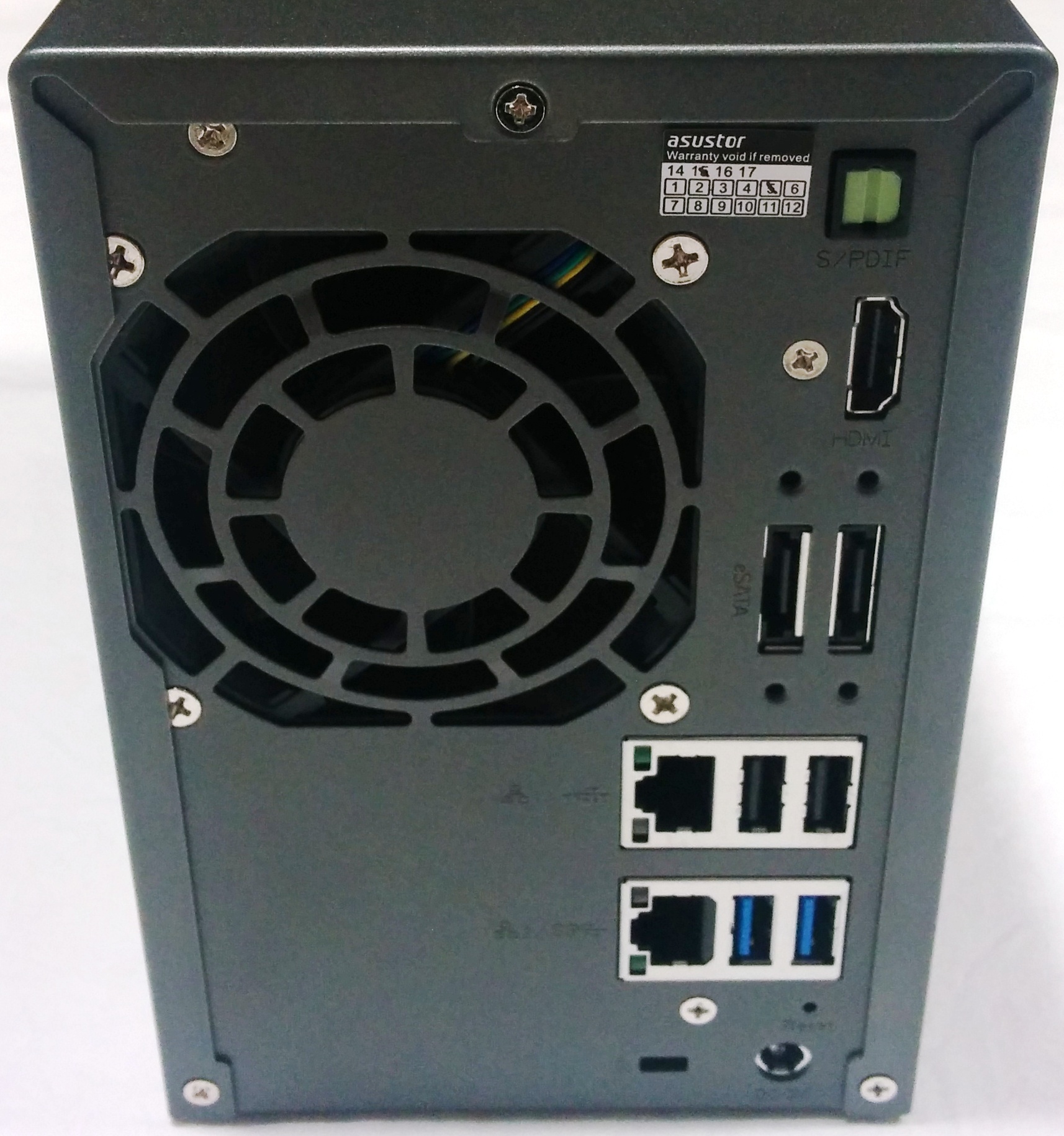 La parte trasera es como la de un ordenador pero en miniatura, y en cierto modo es así, ya que el servidor NAS cuenta con su placa base, procesador, y demás componentes que forman un ordenador. Así, el Asustor AS5002T presenta en la parte trasera la rejilla de salida de aire del ventilador que hay en su interior, un porto óptico S/PDIF para conectar un sistema de audio HT, salida HDMI para conectar un televisor para la reproducción del contenido multimedia, dos puertos eSATA, dos puertos USB 2.0 y dos USB 3.0, dos puertos LAN rj45 que nos brinda más funcionalidad del servidor NAS, y por último el conector de alimentación, el botón de reinicio de la configuración de fábrica del servidor, y la ranura de seguridad Kensington.