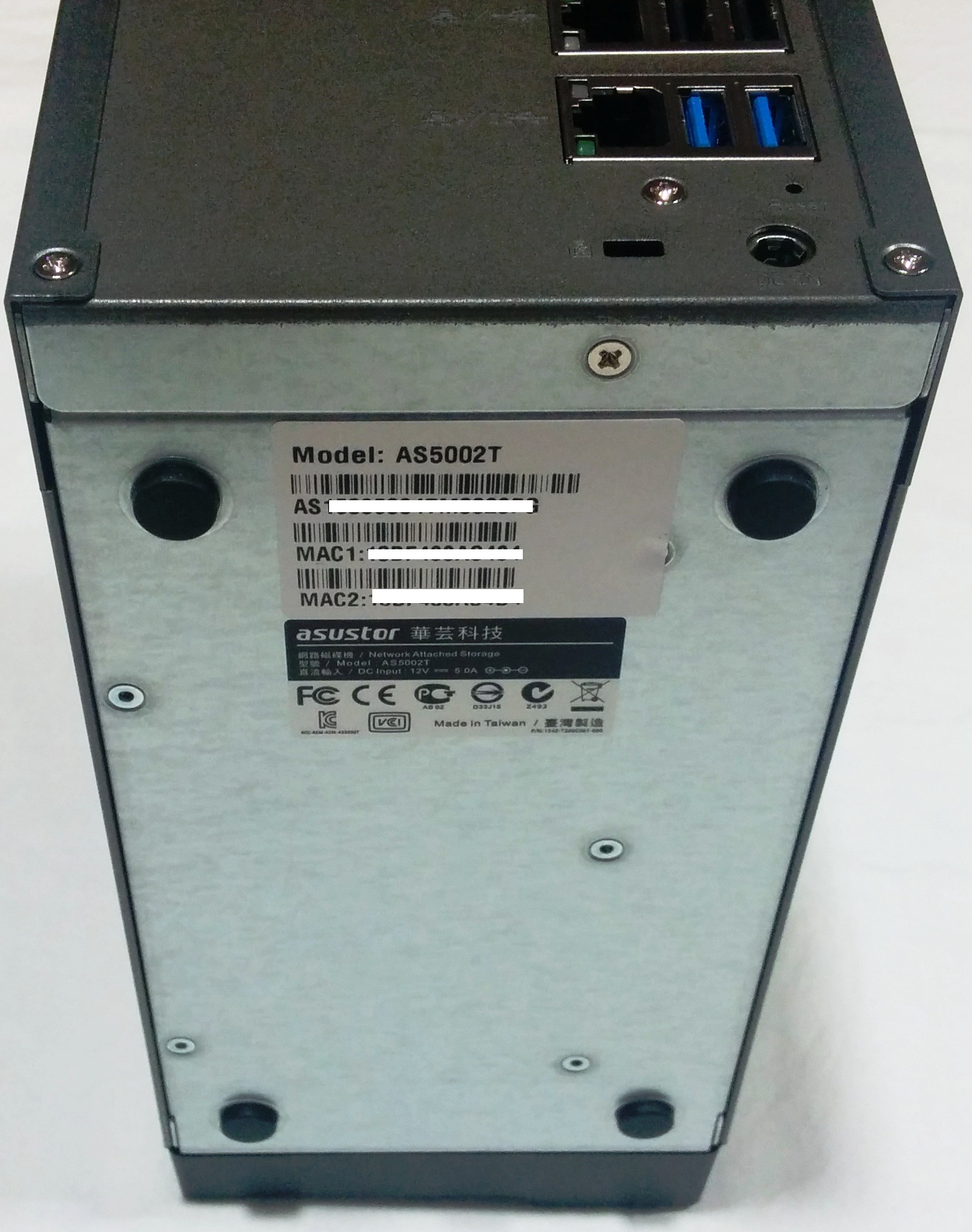 La zona de abajo del servidor NAS lleva unos pies de goma antideslizantes y para amortiguar las pequeñas vibraciones que generan el funcionamiento de los discos duros, y en medio una pegatina con cierta información del dispositivo: modelo, número de serie, las dos MACs de las LAN, potencia de entrada, y los certificados aprobados.