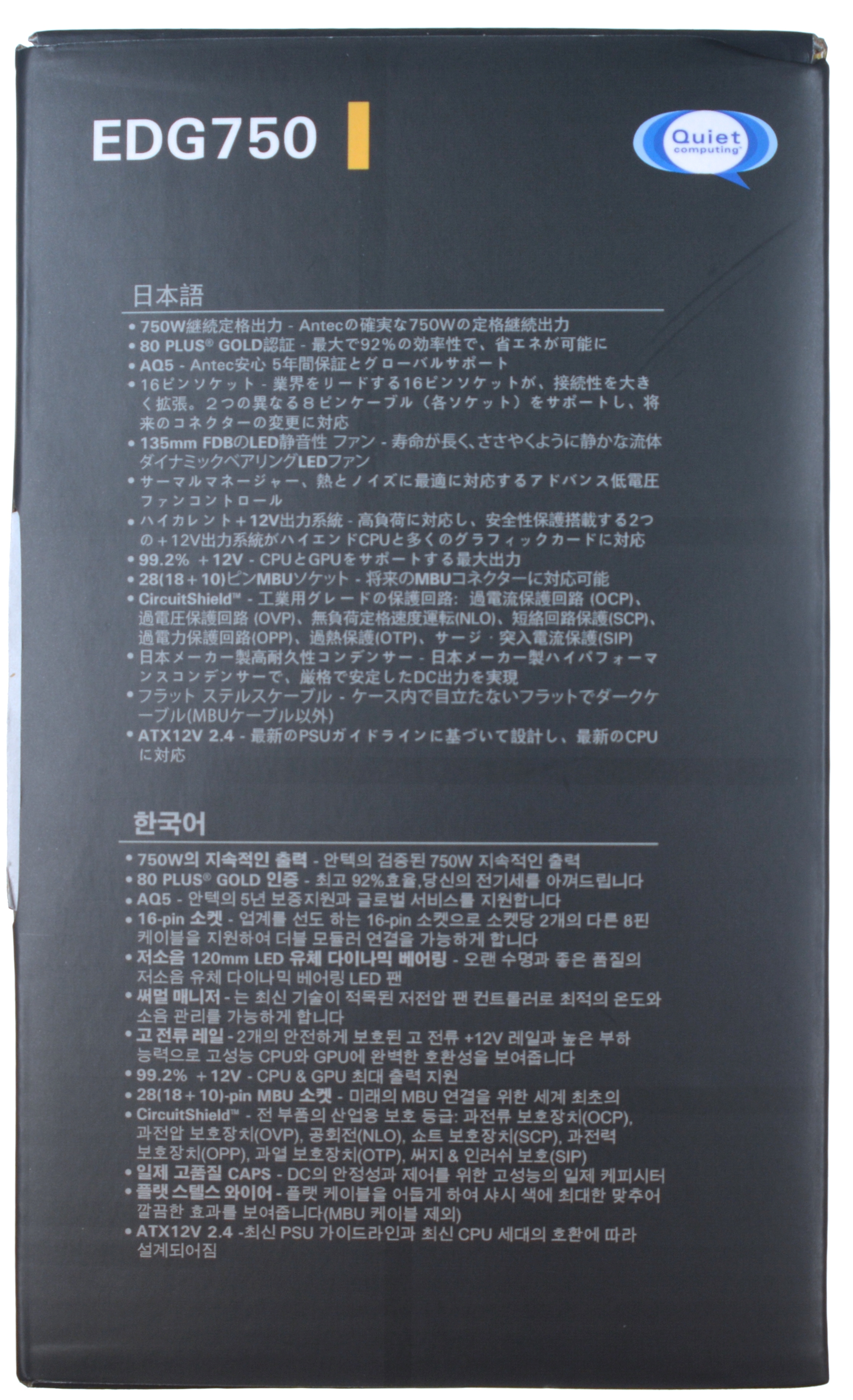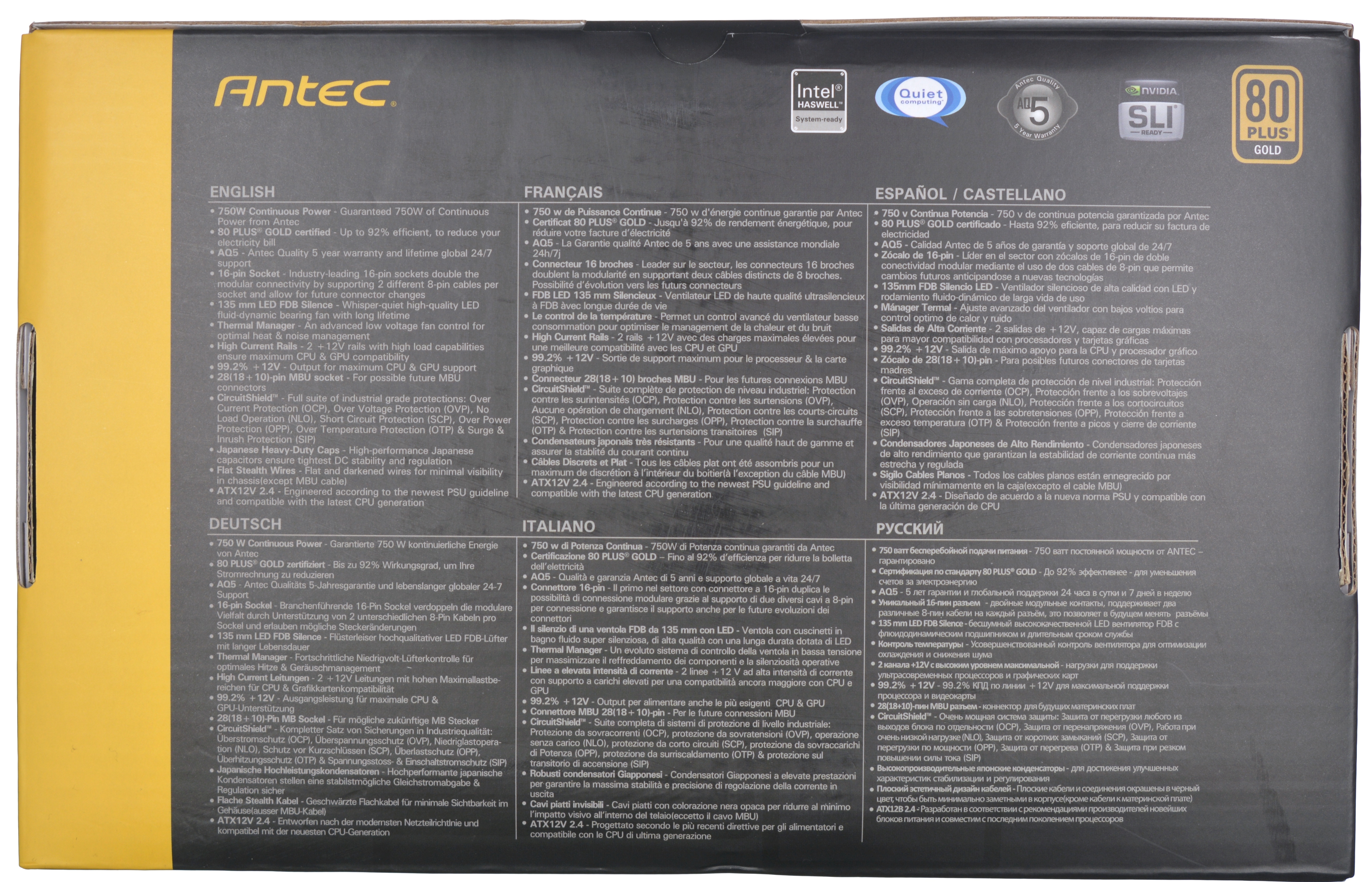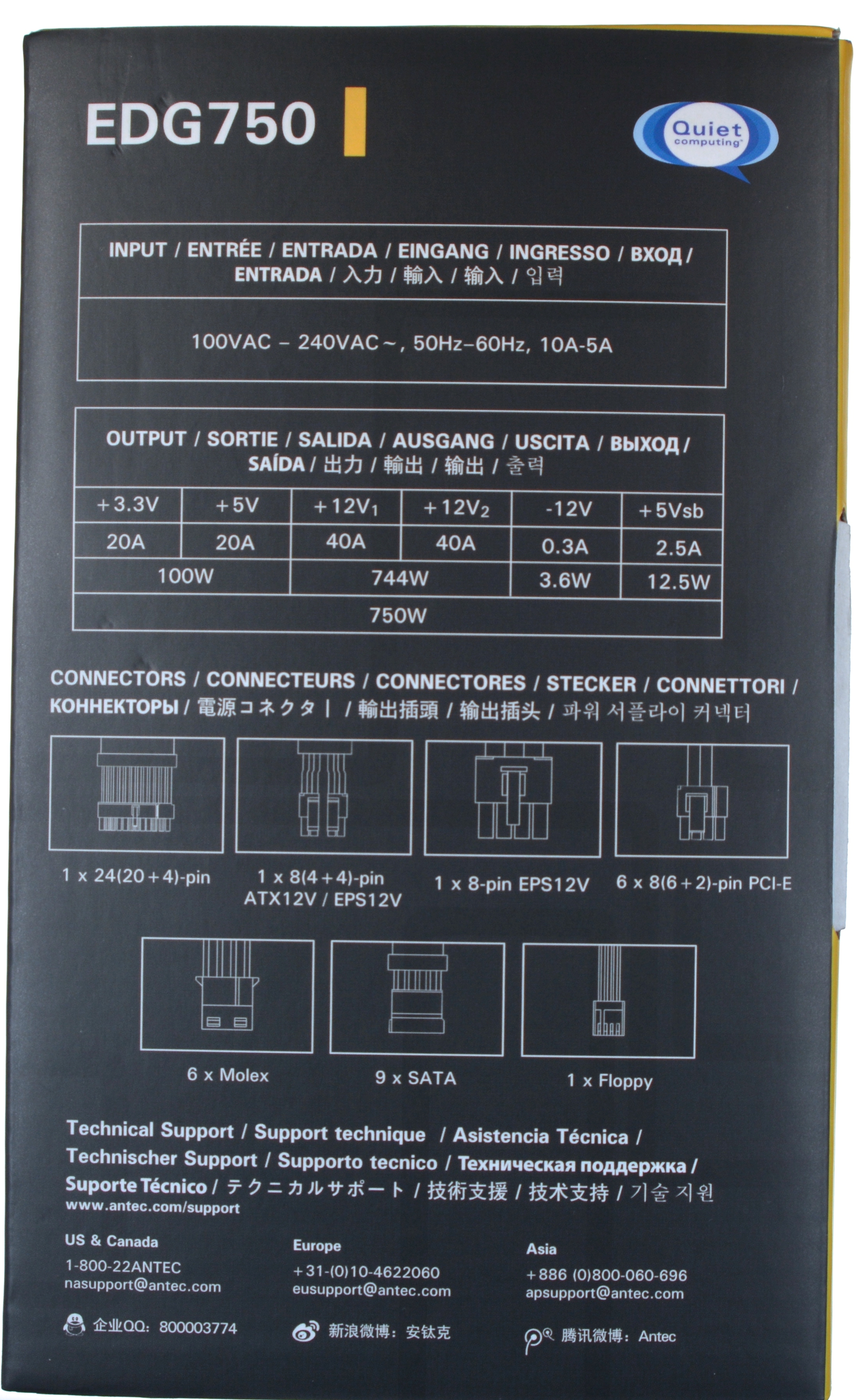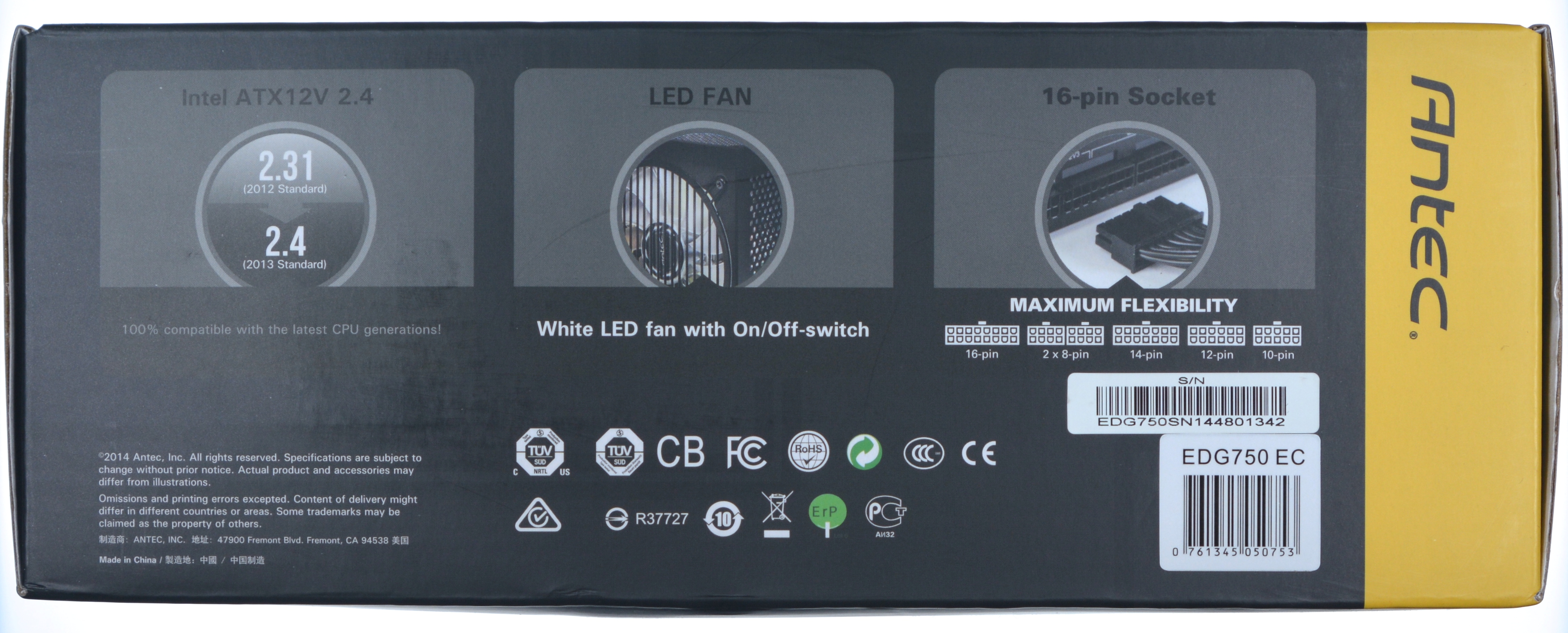 Como es de costumbre ver en este tipo de productos, la fuente de alimentación de Antec, EDG750, viene en una caja de cartón dura, de color predominante negro y amarillo, distintivos de la marca, y está repleta de información para el consumidor. En el lado principal hay una fotografía de la propia fuente, el logo de Antec, la serie a la que pertenece la fuente (Edge Silence defined), la potencia capaz de proporcionar (750W con los estándares ATX12V v2.4 y EPS12V v2.92), algunas características (92% de eficiencia máxima, acoples de goma anti-ruido, ventilador interno silencioso de 135mm y con LED, y que es 100% modular), y la certificación 80 PLUS Gold e Intell Haswell.