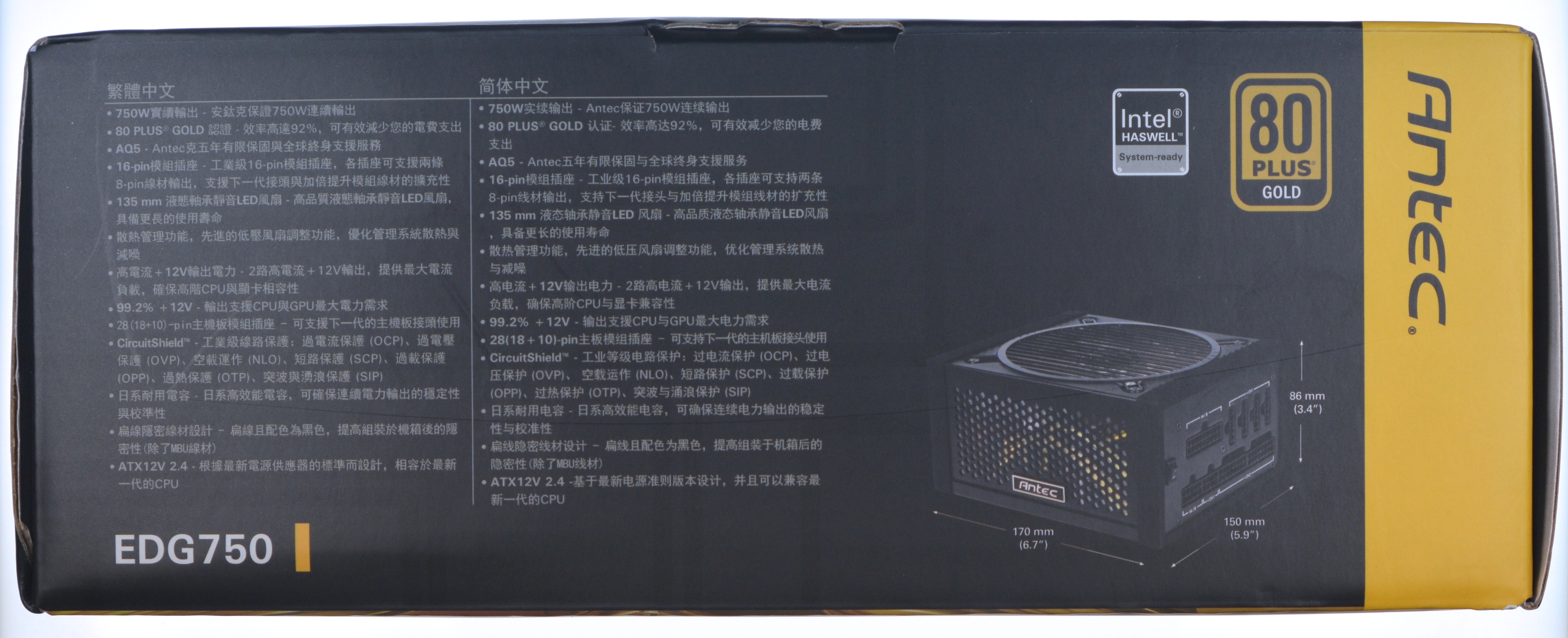 Por el lado superior se nombran otra vez las características en dos idiomas mas, y una imagen pequeña de la PSU EDG750 con sus dimensiones: 170 x 150 x 86mm.