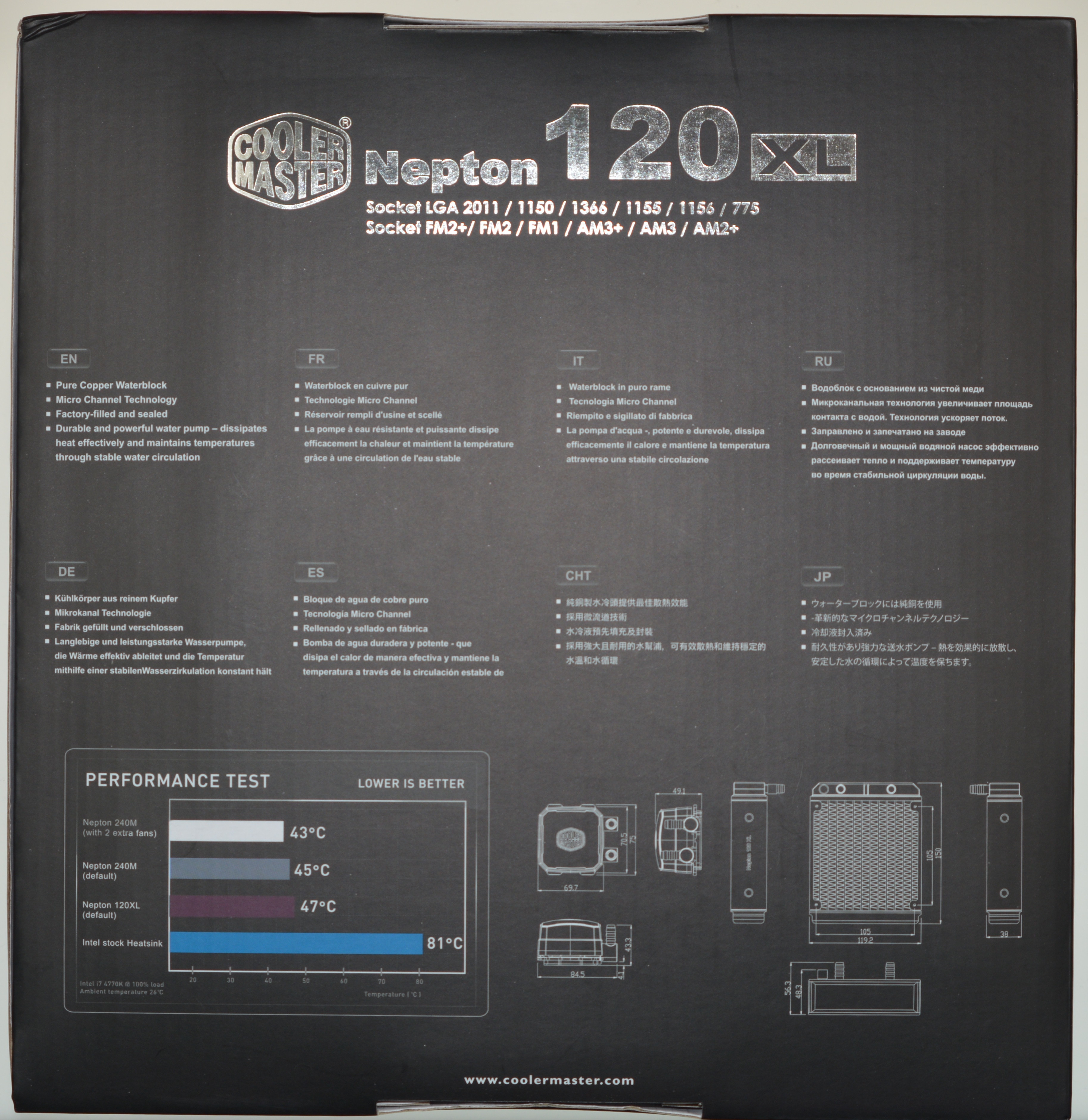 En la parte opuesta, la compañía escribió en varios idiomas algunos detalles (bloque de agua de cobre puro, tecnología micro channel, rellenado y sellado en fábrica y bomba de agua duradera y potente que disipa el calor de manera efectiva y mantiene la temperatura estable a través de la circulación), y una prueba de rendimiento que lo compara con otros modelos de la compañía y del disipador de Intel. Además, hay unas pequeñas serigrafías que muestran el tamaño del radiador y el bloque de agua.