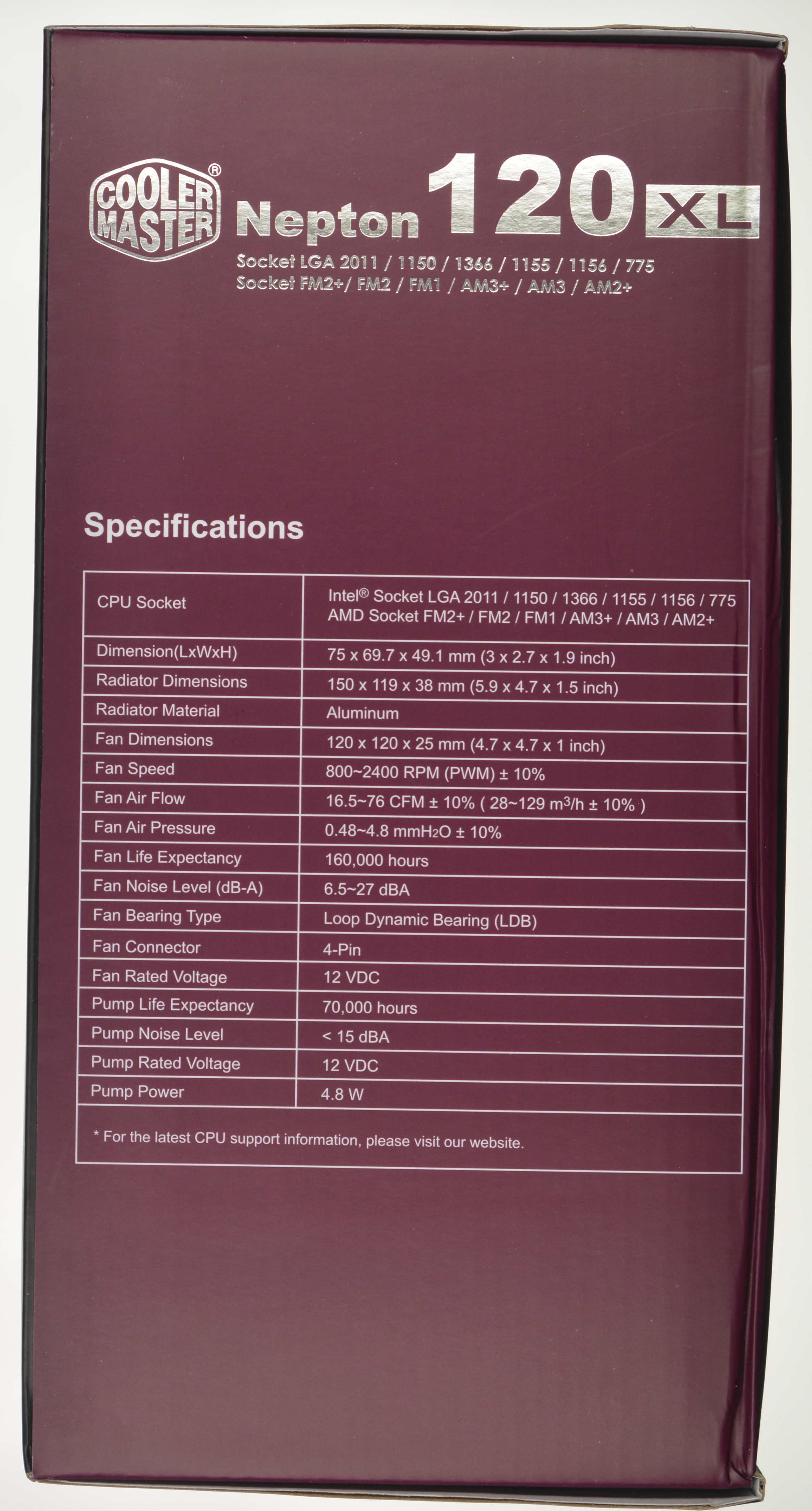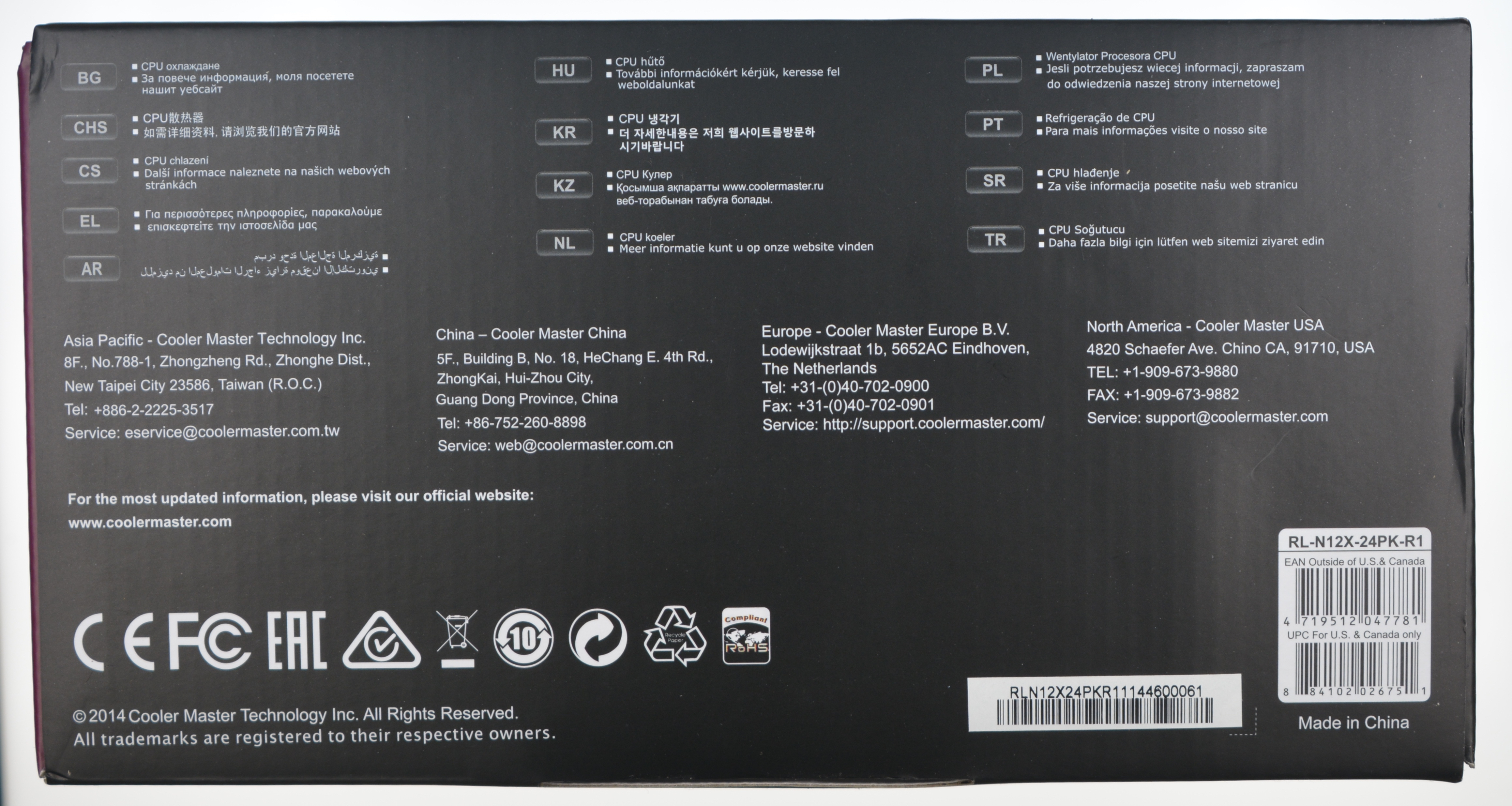 En la parte inferior se encuentran las direcciones de la compañía Cooler Master y el nombre, modelo y número de serie del Nepton 120 XL.