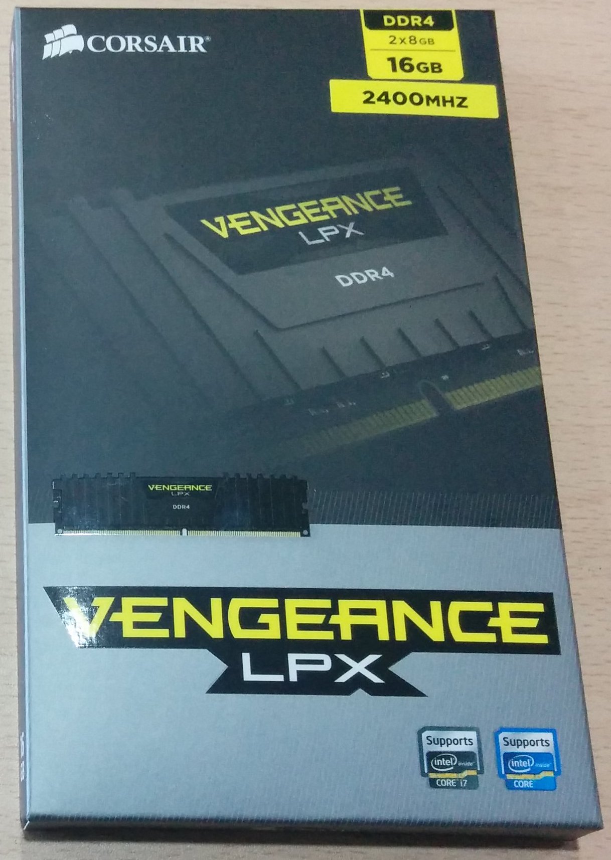 El embalaje empleado por el fabricante para empaquetar estas memorias de alta gama es de una caja de cartón de color negro y gris, distintivos de la marca, y en la cara principal se puede ver en el centro la imagen de un módulo de la memoria DDR4 que contendrá en su interior. Además, en la parte superior se especifica de que se trata de un kit de memoria DDR4 de 16GB (2 x 8GB) y que trabajan a 2400MHz; mientras que en la parte inferior aparece el nombre de la serie a la que pertenece este kit, Vengeance LPX, y los logos se soporte Intel inside Core i7 y Core.