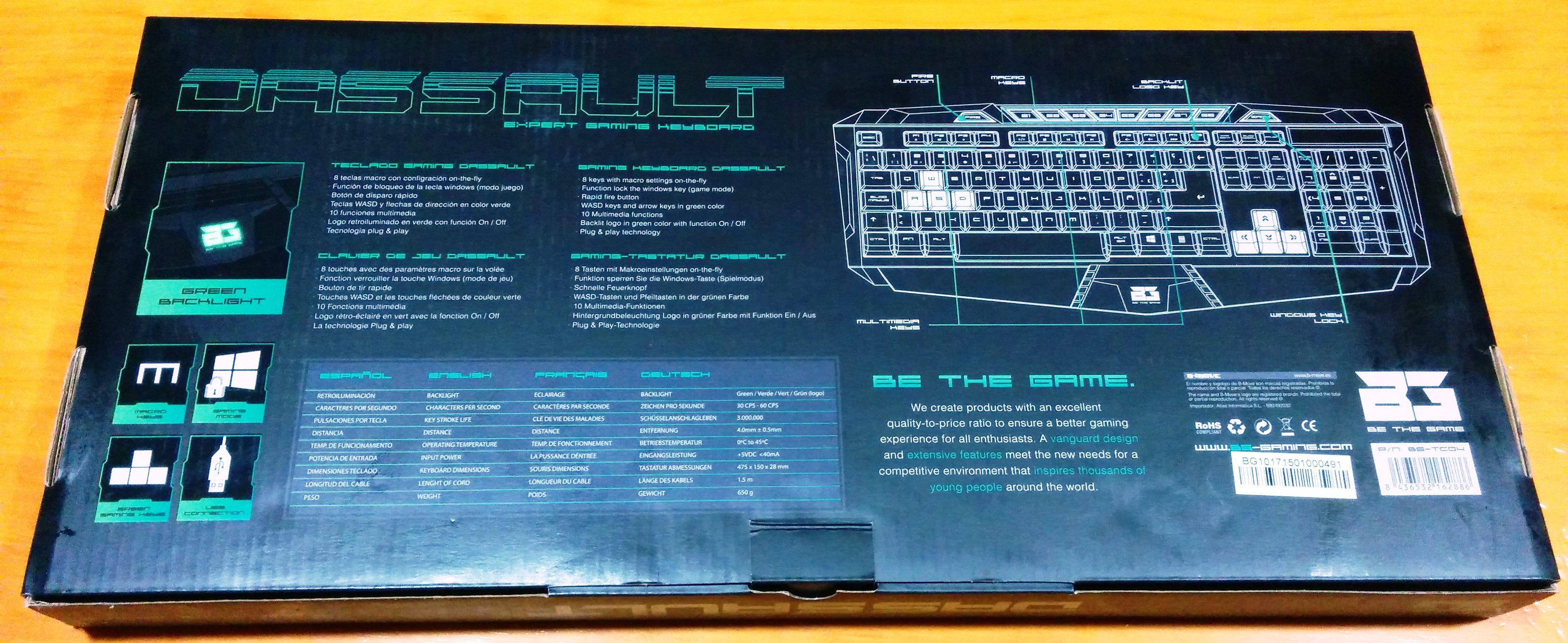 Por la parte trasera se detalla las funciones principales y especificaciones técnicas del teclado Dassault en la zona de la izquierda, que son las que ya hemos comentado en la anterior sección, mientras que en la zona derecha aparece un dibujo del teclado en el que se informa la ubicación de las teclas multimedia, de disparo rápido, los macros, la tecla de bloqueo de Windows y la teclado del logo, pero esto lo detallaremos mejor en la siguiente sección…