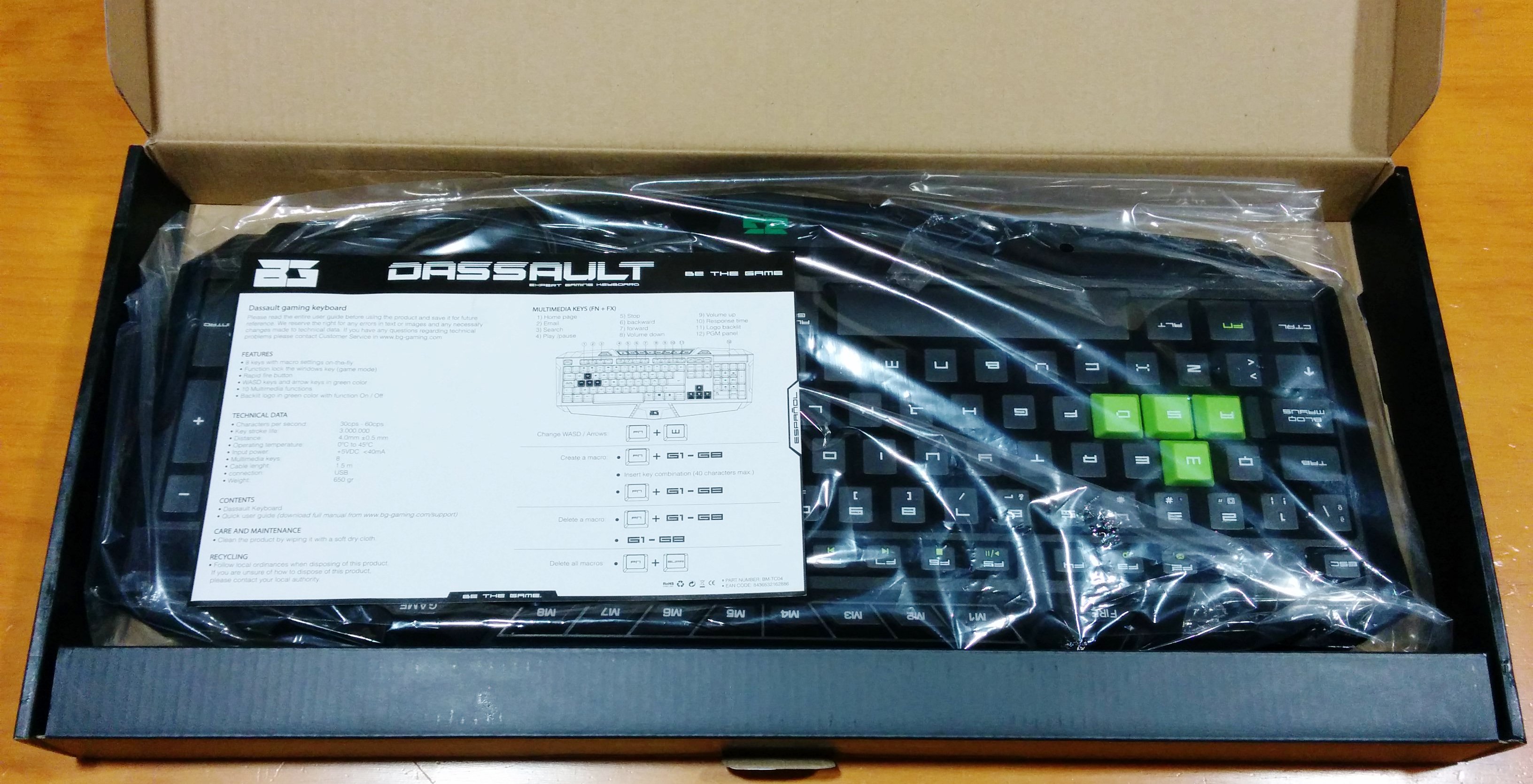 El teclado BG Dassault viene de la misma forma que este tipo de productos, en una caja de cartón rectangular, en este caso de color negro y verde, colores que identifican a la compañía, y con varias ilustraciones e información en sus lados.