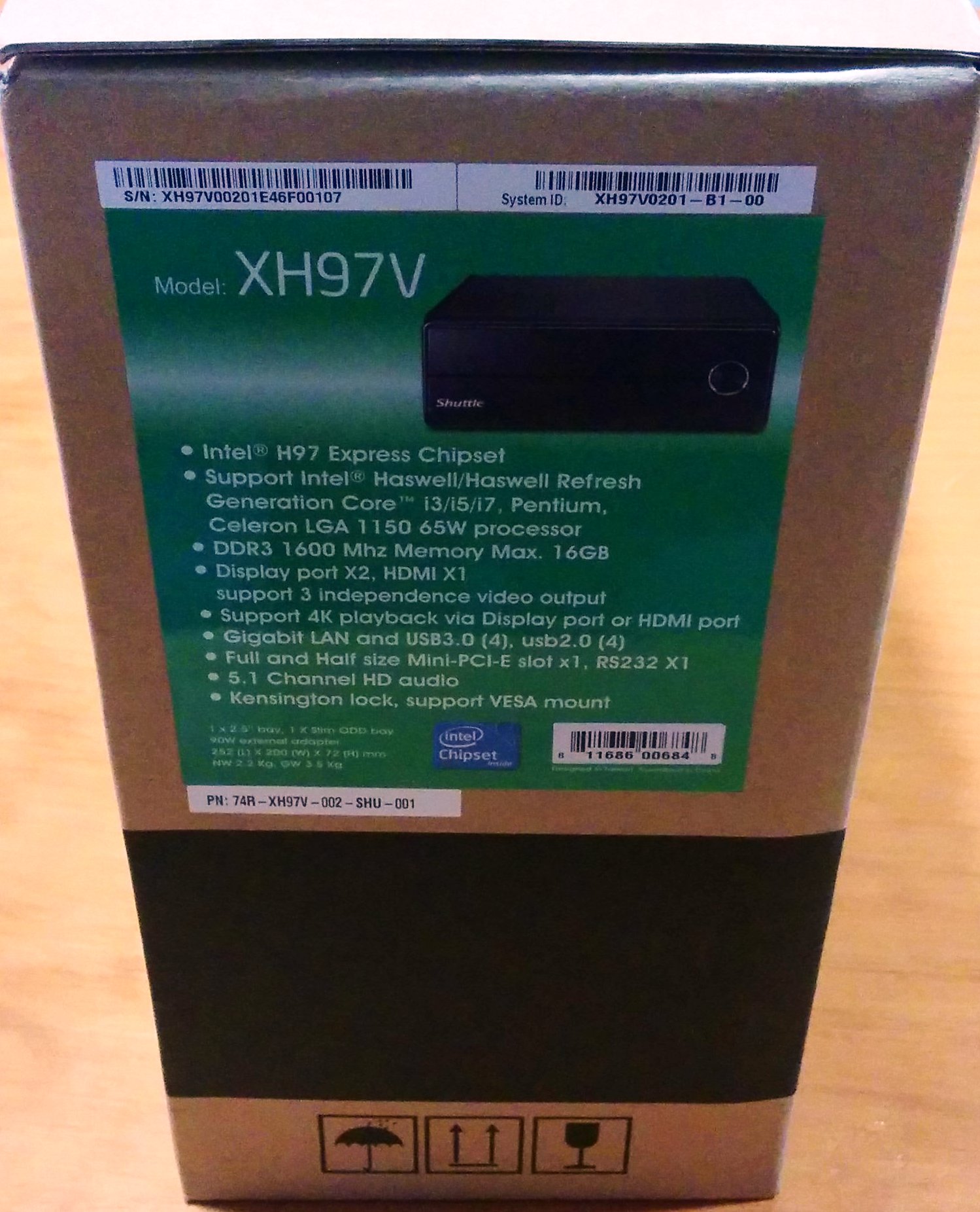 El barebone XH97V viene dentro de una caja de cartón neutro, sin muchos adornos, de forma rectangular y con una asa de mano para transportarlo. En la parte frontal y trasera aparece en color negro la silueta del factor de forma del Slim PC, y destacando por medios de círculos algunas de sus ventajas, como que es pequeño, estiloso, potente y eficiente.