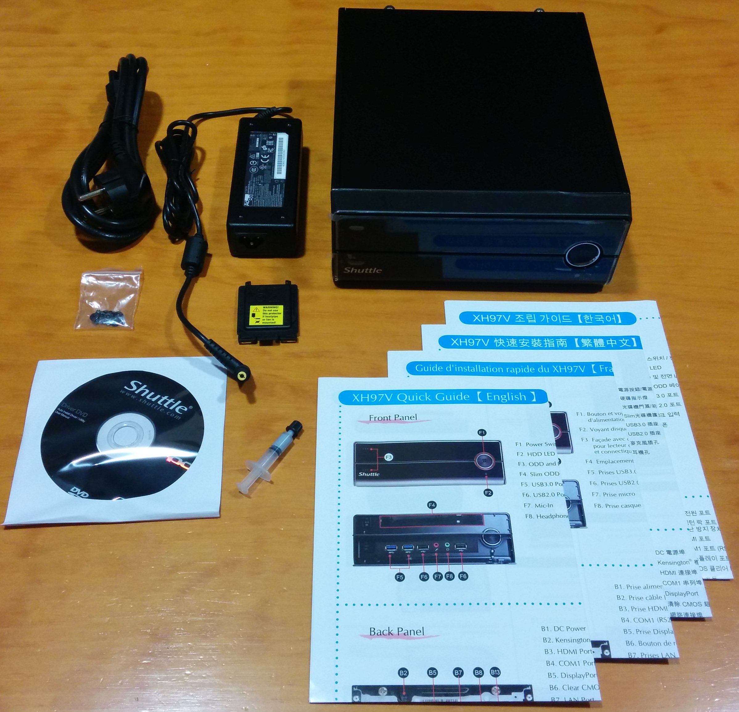 Una vez extraído todo su contenido de la caja, podemos ver el XH97V y los accesorios que incluye: cable de corriente, fuente de alimentación externa de 90W, una jeringuilla de compuesto térmico, una cubierta protectora del socket LGA1150, tornillos de instalación para las unidades de almacenamiento y óptica, y las guías de usuario en varios idiomas.