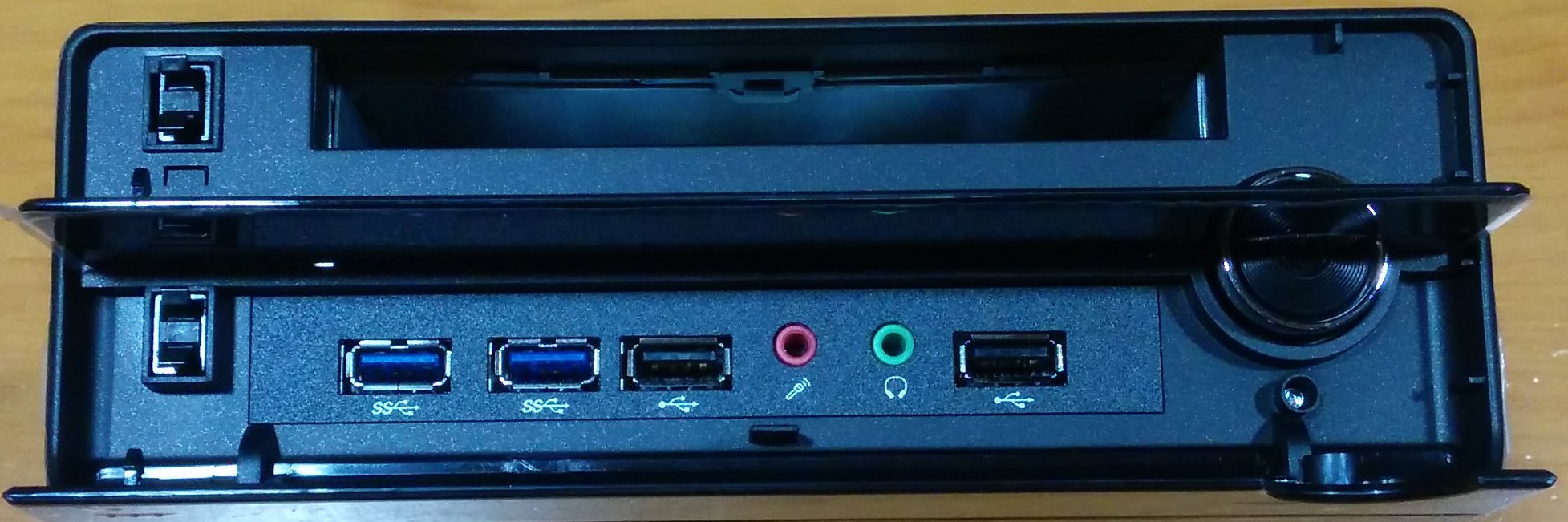 Se nota que Shuttle tiene buen gusto. El Slim PC XH97V posee un diseño elegante pero atractivo, con formas redondeadas y suaves. El barebone adopta dos tapas, una en la parte superior, que al abatirla tendremos acceso a la unidad óptica, mientras que con la inferior nos aguarda los conectores frontales, que son los dos puertos USB 3.0 (azules), dos conectores USB 2.0 (negros), y los dos conectores de 3.5mm para la entrada de micrófono (rosa) y salida de auriculares (verde).
