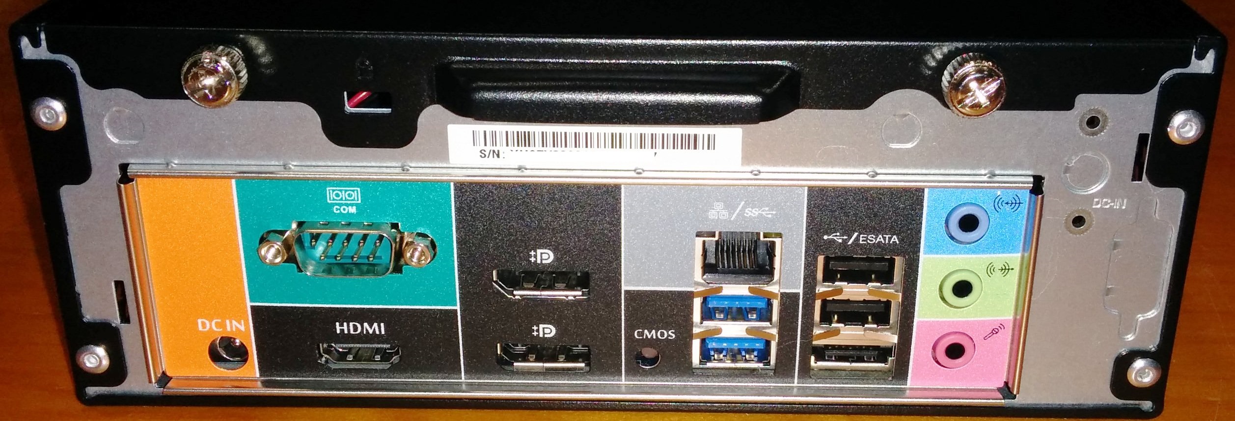 Por la parte trasera nos encontramos con los dos tornillos de mano para abrir la tapa superior, y todo el panel trasero de la placa base, ofreciendo el conector HDMI, puerto serie RS232, dis DisplayPort, dos USB 3.0, dos USB 2.0, un eSATA, un Gigabit ethernet RJ45, el botón de borrado CMOS, los tres conectores jack 3.5mm para entrada/salida de audio, y en un lateral el conector de entrada de corriente DC IN, que es donde se conecta la fuente de alimentación externa que se proporciona con el barebone.