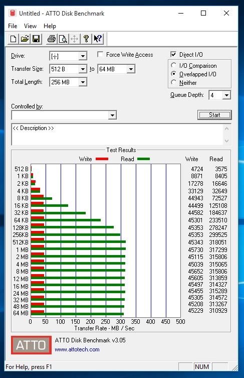 Con ATTO Disk Benchmark, los resultados máximos de lectura y escritura son de 318MB/s y 45.7MB/s, respectivamente.