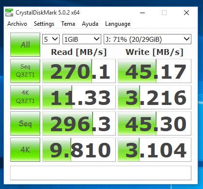 Con Crystal Disk Mark, los resultados de lectura y escritura secuenciales son de 270MB/s y 45.17MB/s, respectivamente, mientras que en 4K son de 9.8 MB/s y 3.1 MB/s.