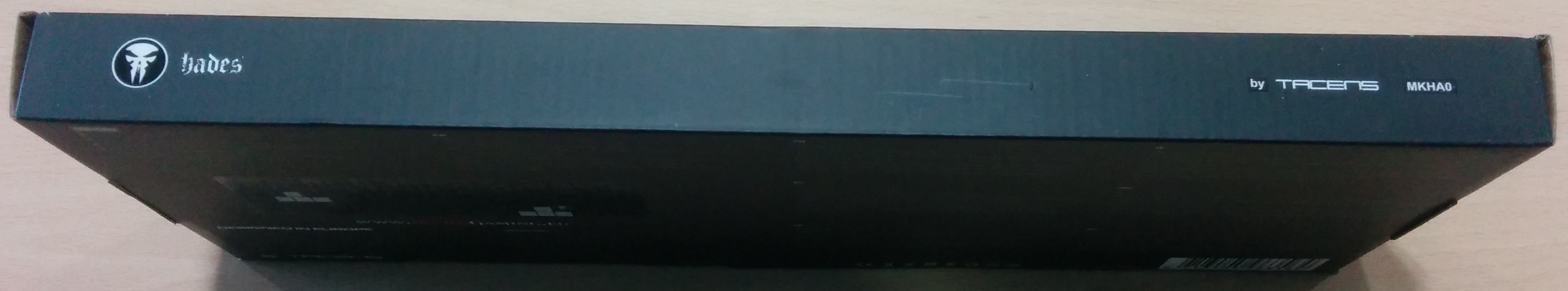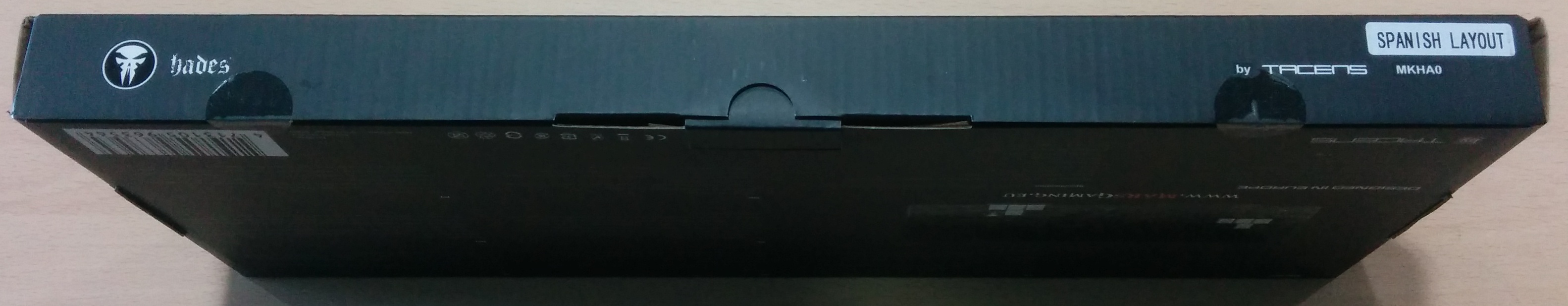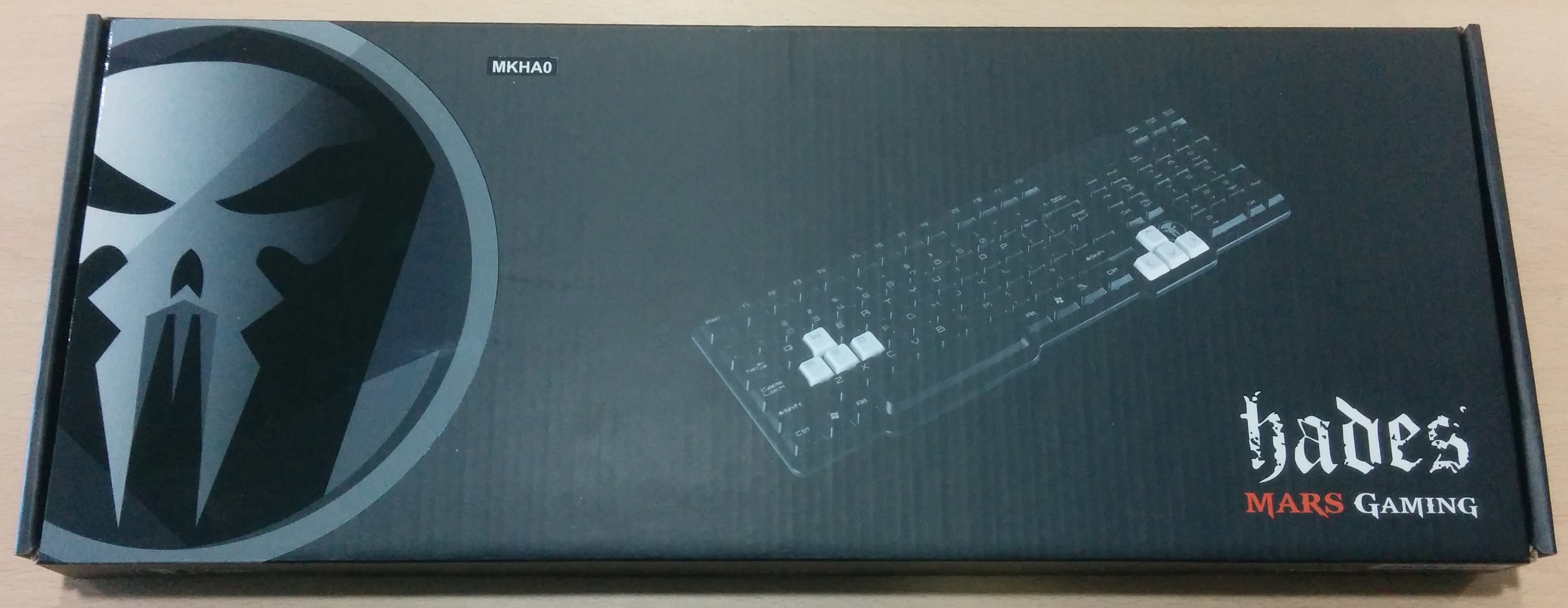 Al igual que su hermano mayor, pero con dimensiones más pequeñas, el teclado MKHA0 viene en un embalaje de cartón que predomina el color negro, dándole así un toque de oscuridad homenajeando al Dios griego del inframundo.