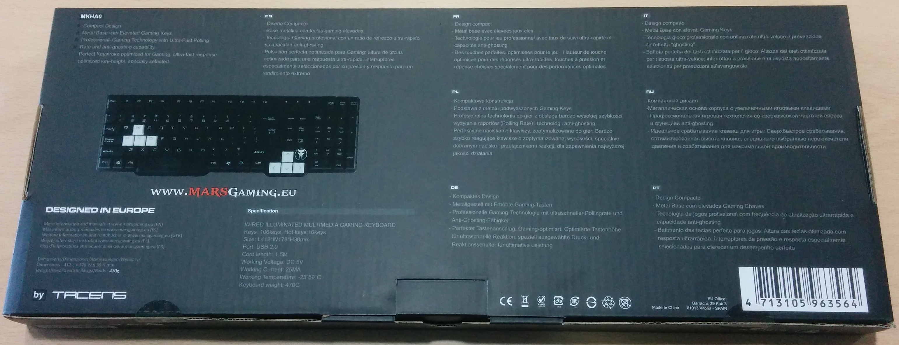 Mientras que en la parte trasera se muestra el teclado en una foto, también algunas especificaciones técnicas, la web de Mars Gaming, construido por Tacens, y algunas características principales en varios idiomas: diseño compacto, base metálica con teclas gaming elevadas, tecnología gaming profesional con un ratio de refresco ultra-rápido y capacidad anti-ghosting, y pulsación perfecta optimizada para una respuesta ultra-rápida, interruptores especialmente seleccionados por su presión y respuesta para un rendimiento extremo.