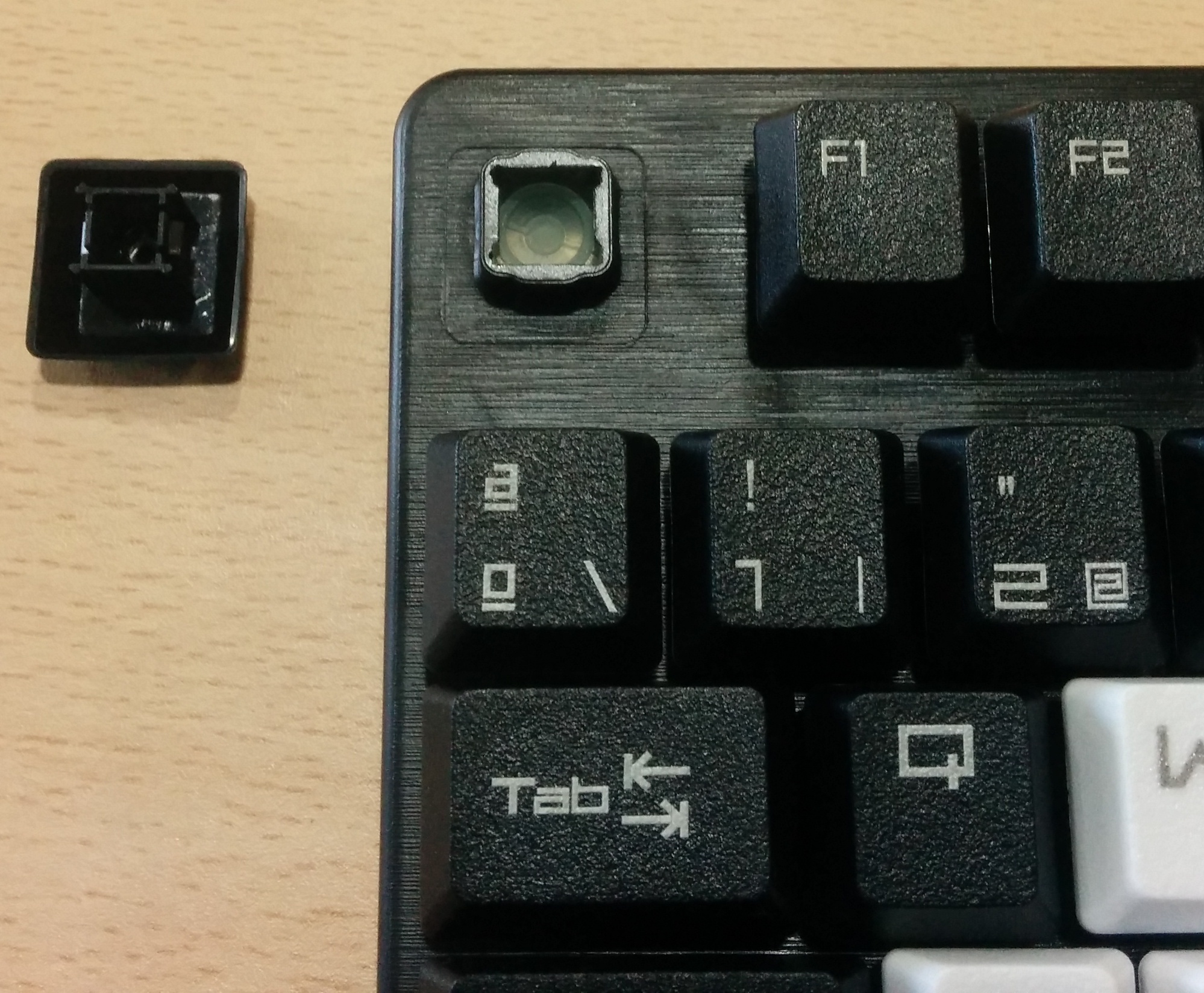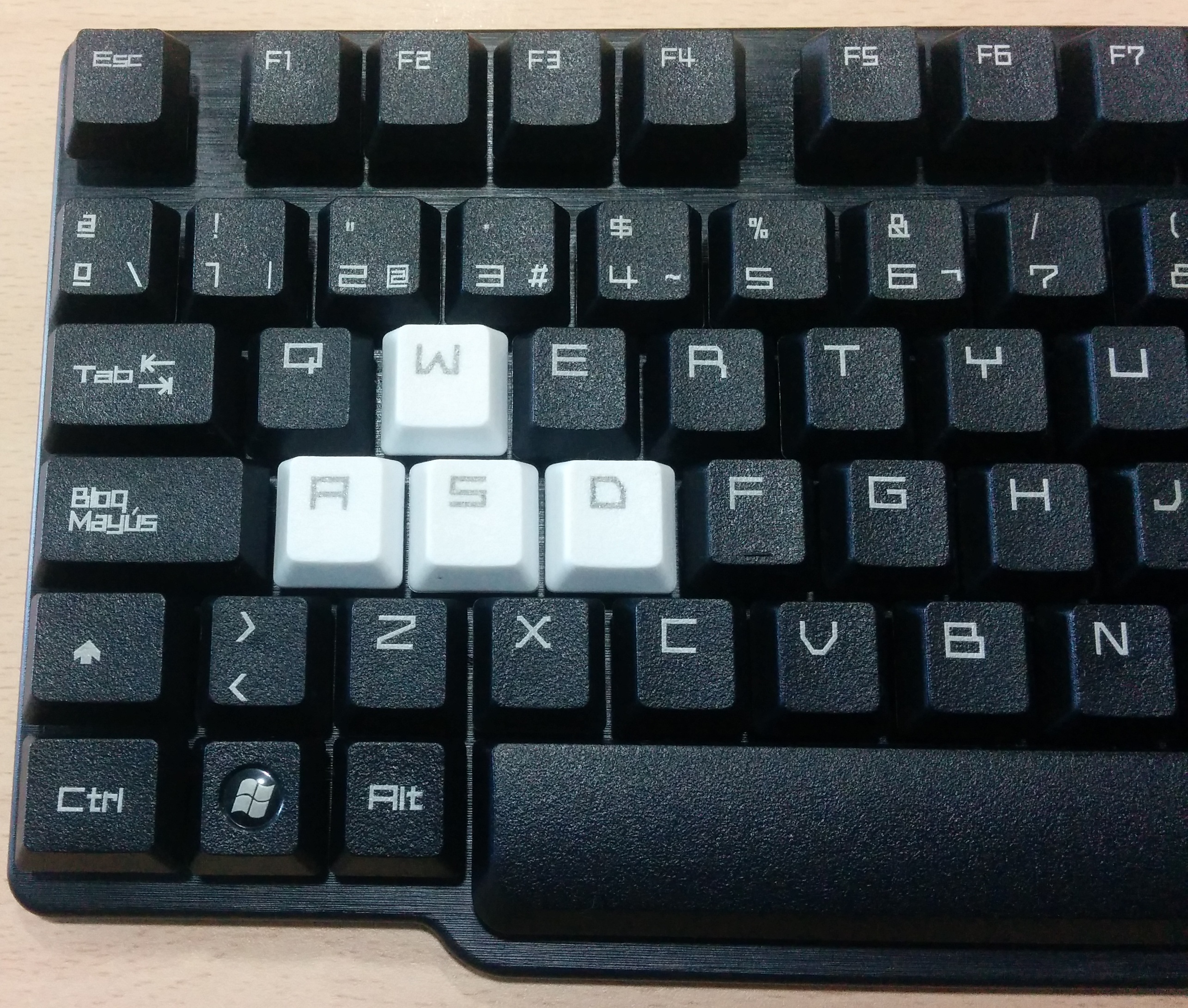 Las teclas son elevadas, de hecho están como suspendidas sobre una base de plástico cepillado resistente como podéis comprobar en la siguiente imagen. Además, las letras presentan un estilo cuadrado que muy pocas veces se ven en la gran mayoría de teclados.
