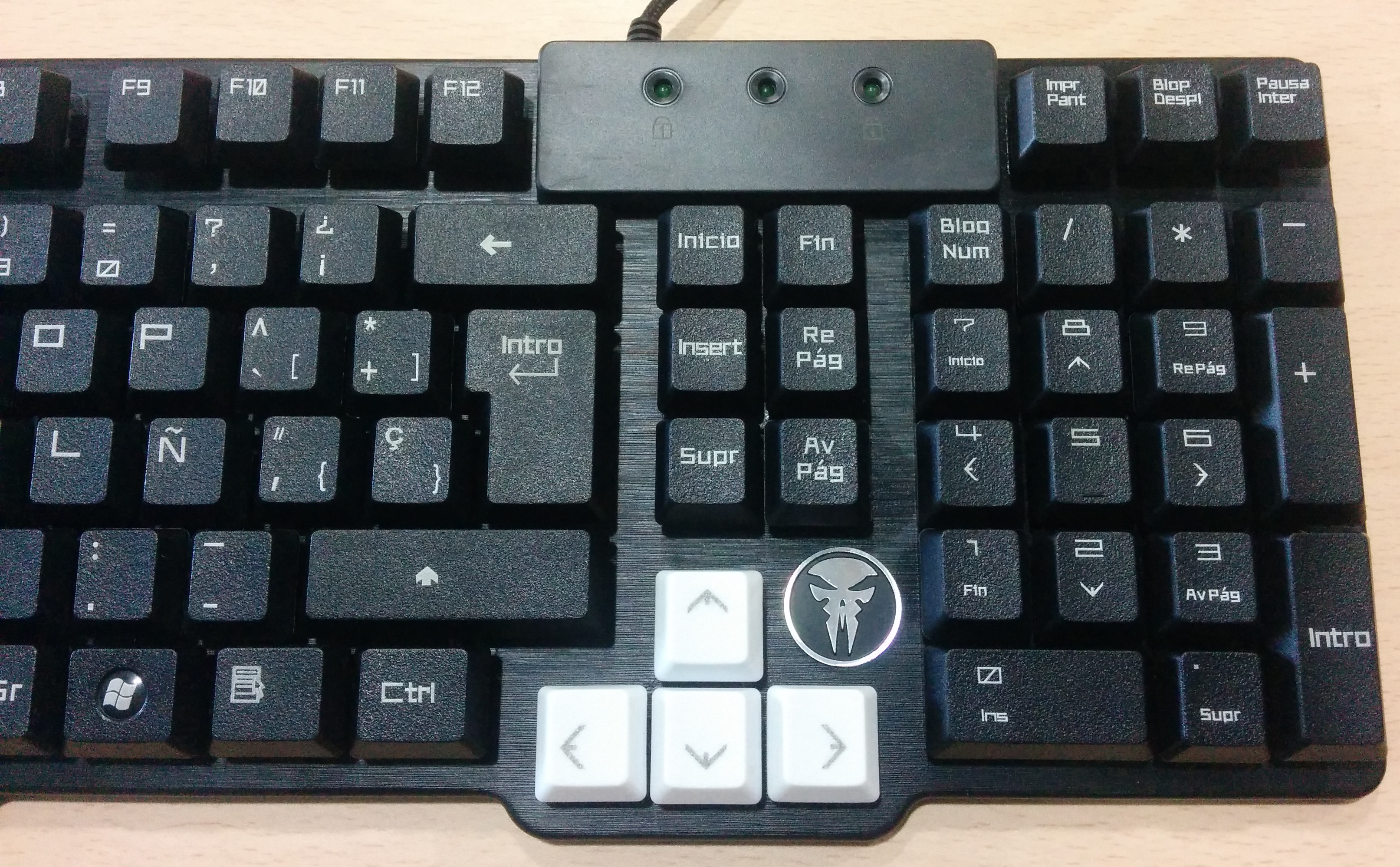 De la parte izquierda del teclado podemos destacar las tres teclas de color blanco, que son las utilizadas para los juegos, mientras que en la parte derecha destacan también las teclas de desplazamiento en color blanco, y el logo calavera de la marca Hades de Mars Gaming.