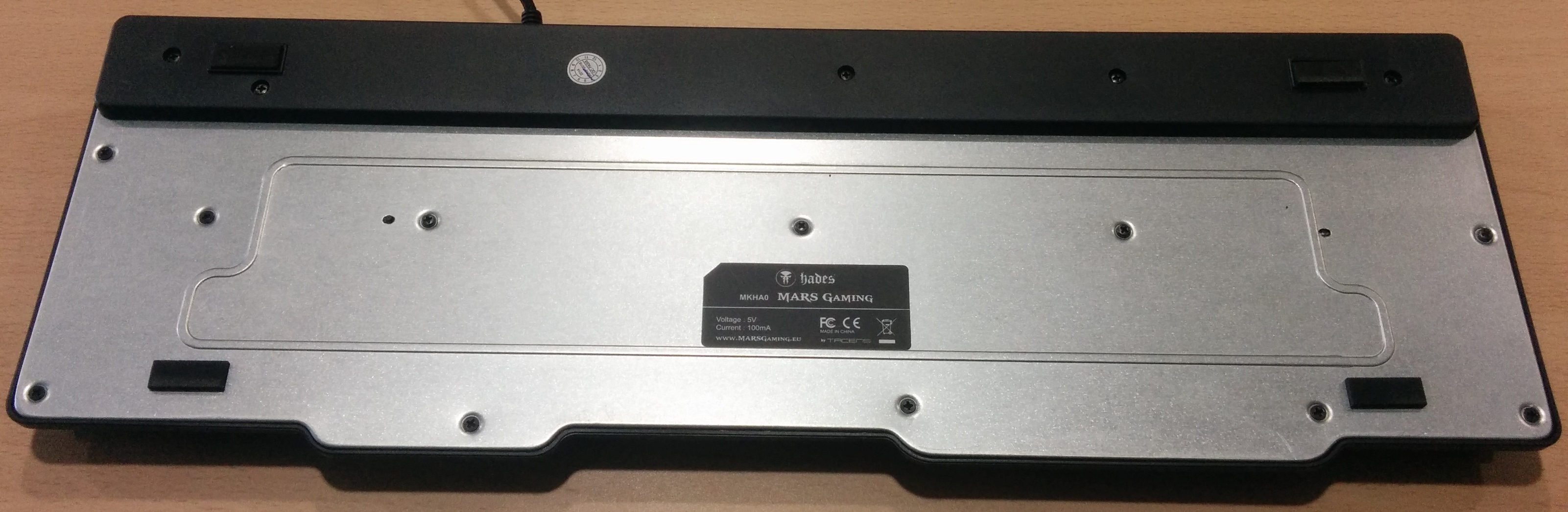 Dándole la vuelta al teclado vemos claramente la base metáliza, excepto en la zona superior que es de plástico resistente y está un poco más elevada que la base metálica para ofrecer un poco de inclinación. Además, en las cuatro esquinas cuenta con unas gomas antideslizantes para que el teclado no se mueva de la superficie ni en los momentos más intensos del juego.