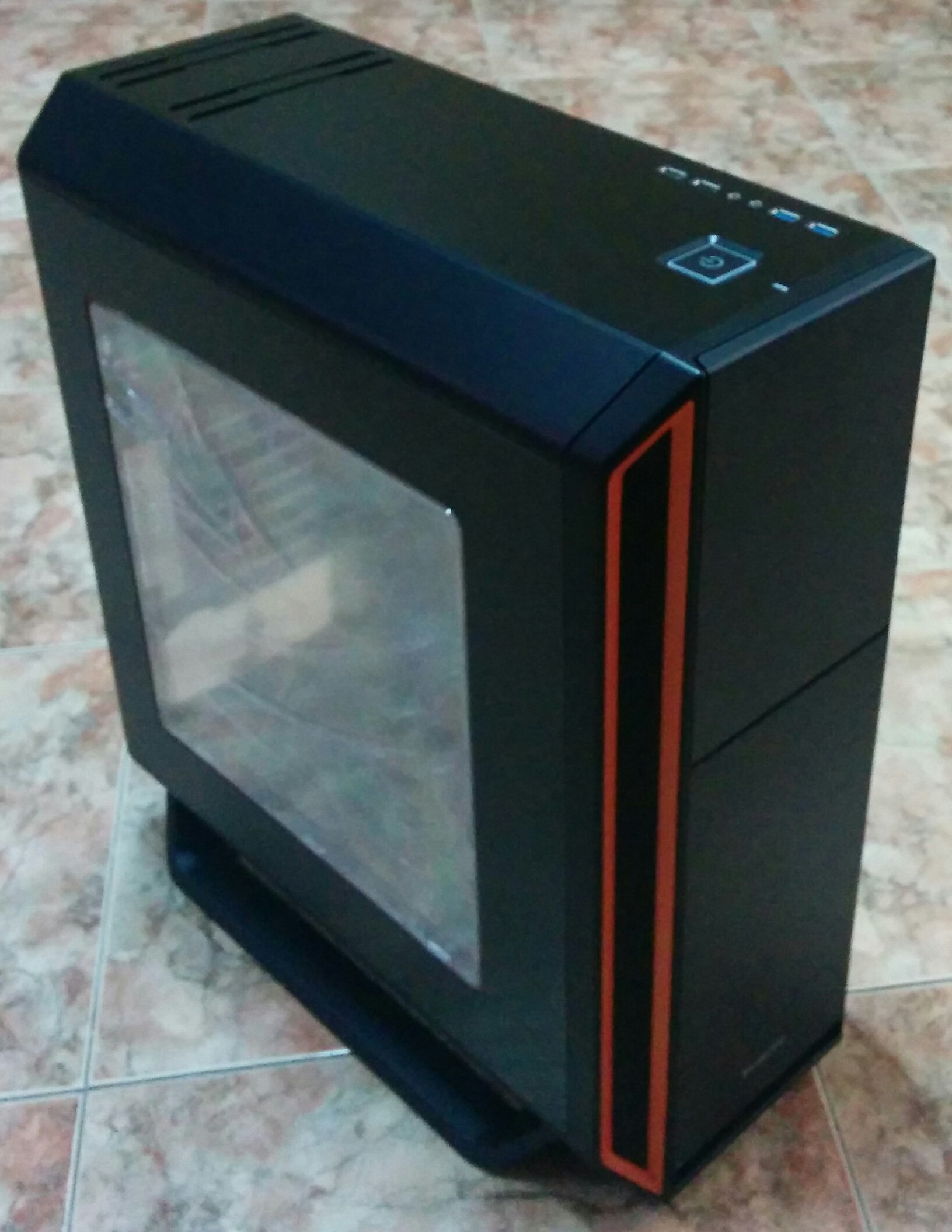 Su parte inferior es un panel completamente sólido, sin ninguna rejilla de ventilación, y dos patas laterales (en nuestro caso de color negro, ya que nuestro modelo es Orange, pero por ejemplo el Silver sería de color plateado) que cuentan con unas gomas anti-deslizantes. Estas patas no vienen pre-montadas en la carcasa, por lo que hay que acoplarlas una vez que se ha desembalado la carcasa del embalaje.