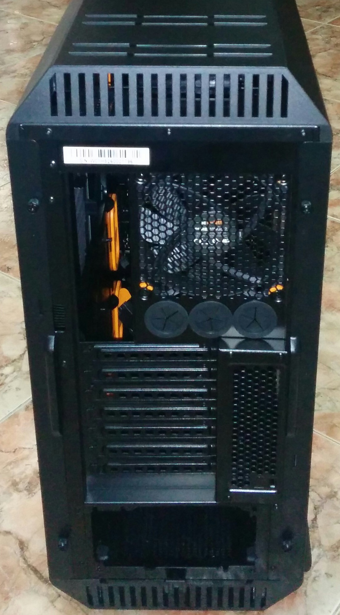 Si nos fijamos ahora en la parte trasera de la Silent Base 800 Window, mirando de arriba hacia abajo, veremos unas pequeñas rejillas verticales de ventilación, justo debajo una pegatina que aparece el número de serie de la carcasa, después la apertura donde irá el panel trasero de la placa base, y a su lado un tercer ventilador PureWings de 120mm para la extracción del aire.