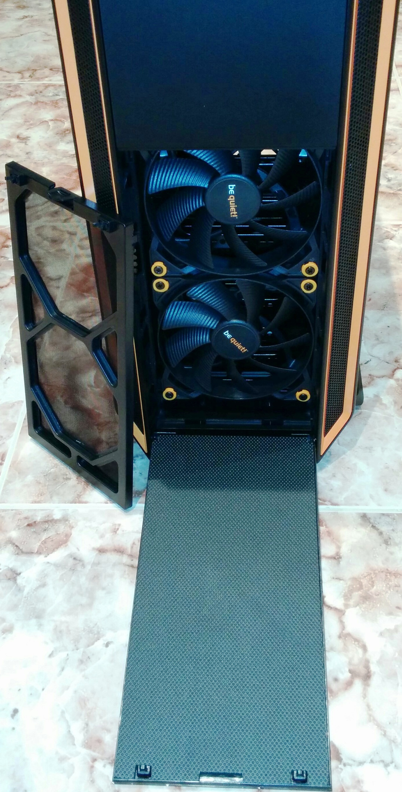 Debajo de ésta tenemos otra puerta que se abre hacia abajo pulsando las dos puntas superiores. En el interior de la puerta encontraremos un poco más de material de reducción de ruido y un filtro de polvo fácil de sacar. Por detrás del filtro vemos los dos ventiladores SilentWings 2 de 140mm que se incluyen, y que su propósito es de insertar aire fresco al chasis.